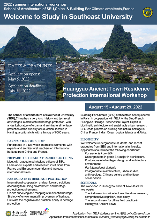 OverviewOriginated in the Song Dynasty, Huangyao Ancient Town has a long history of more than 1000 years as a famous historical and cultural town in China. The town has beautiful natural scenery. There are still hundreds of residential buildings during the Ming and Qing Dynasties in the ancient town. The town was once selected as one of the ten most beautiful ancient towns in China. In recent years, due to the continuous removal of the indigenous people in Huangyao Ancient Town and the gradual commercialization of the main street, the occupancy rate of residential buildings has been declining. The ancient houses in the Ming and Qing Dynasties are in urgent need of maintenance and repair, and the authenticity of the living environment in the town also needs reasonable protection.The workshop in Huangyao Ancient Town includes lectures online and practice offline. In the form of fast-paced teaching, the workshop enables students to pay attention to the comfort of ancient folk houses, simulate international cooperation and put forward comprehensive plans according to the building environment and heritage protection requirements of folk houses, and cultivate the cognitive and practical ability of the new generation of Chinese and European architectural students in heritage protection. Students who have completed the course can get Summer School Certificate of SEU. Welcome students interested in this course to sign up!