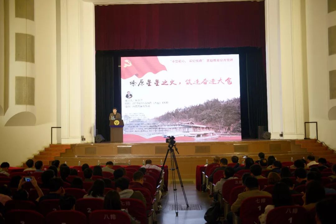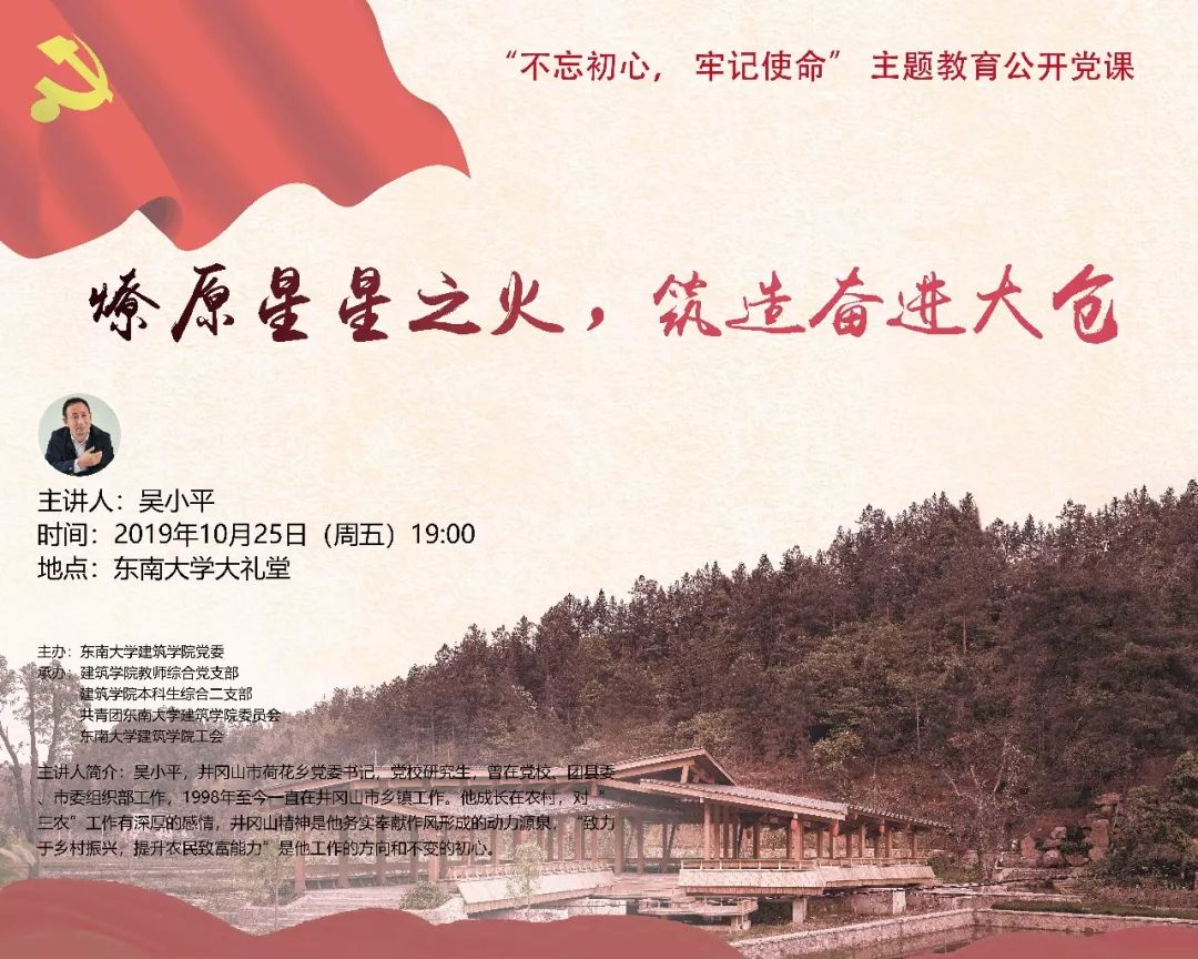 2019年10月25日晚,由万博manbetx官网 党委主办,万博manbetx官网 教师综合党支部、万博manbetx官网 本科生综合二支部、共青团万博manbetx官网 委员会以及万博manbetx官网 工会承办的“不忘初心、牢记使命”主题教育公开党课第二讲之“燎原星星之火,筑造奋进大仓”在东南大学四牌楼校区大礼堂举行。本次党课面向全校师生开放,由万博manbetx官网 党委书记冷嘉伟主持,井冈山市荷花乡党委书记吴小平主讲。