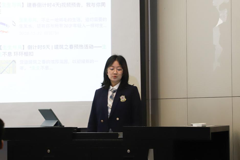 会上,主席团的项林康同学首先进行述职。随即,学生会、团委各部门负责人进行了三分钟的述职报告,主要围绕上一学年的成果展示、部门发展、不足之处以及未来期望等展开,做出了全面清晰的报告内容,让参会的老师与同学们感受到团委与学生会的真切付出和蓬勃发展。主席团积极推行校院班的三级联动体制,各部门不断创新改革;新生文化季、建筑之春等活动都凝聚了各个部门的辛勤付出,公众号等平台的运营、活动海报等的设计,展现出各部门的汗水与心血……在聆听完各负责人的述职报告后,与会的学生会和团委成员以及各班代表对负责人进行匿名评级。