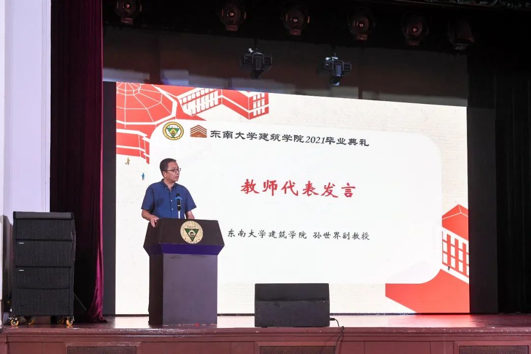 在建院学习的日夜,总是离不开老师们的一路陪伴;万博manbetx官网 对于莘莘学子的成功培养,也离不开所有老师的辛勤努力。而今,2021届毕业生即将踏上新的征程,老师们也同样有很多话要表达。东南大学第十一届“我最喜爱的研究生导师”孙世界老师应邀作为建院教师代表,为大家送上毕业祝福。孙老师在对同学们的成长与进步表达喜悦与祝贺之余,也为同学们带来了三点建议,分别是“加强学习”、“坚定目标”和“乐观生活”。谆谆教诲温暖了在座学子,更为同学们增添了一份勇往直前的力量。