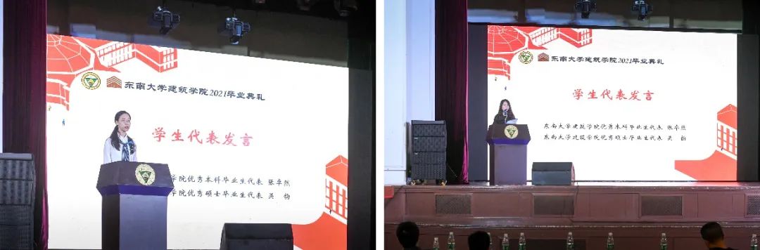 随后,两位本科与硕士优秀毕业生代表张卓然同学与吴韵同学分别发言,在回顾学院生活的美好之余,也表达了对学院、对老师的感谢与对未来的憧憬与展望。张卓然同学引用张广军校长曾说过的一句话来表达五年的收获与感悟:“东南大学的每一位学子,都要勇担‘至高的使命’、形成‘至中的智慧’、涵养‘至善的境界’。”她提到:“万博manbetx官网 用博大宽广的胸怀,在一点一滴中哺育了我们的成长,见证了我们的蜕变。”而吴韵同学则表示:“万博manbetx官网 所带给我们的,不仅仅是专业知识的增长,更是思想上的成长与蜕变,是开阔的眼界与宽广的格局,是对美与品质的追求,是令我们一生受益的人生经历。”在讲话的最后,她更是借校歌抒发志向,也为所有毕业生送上祝福。