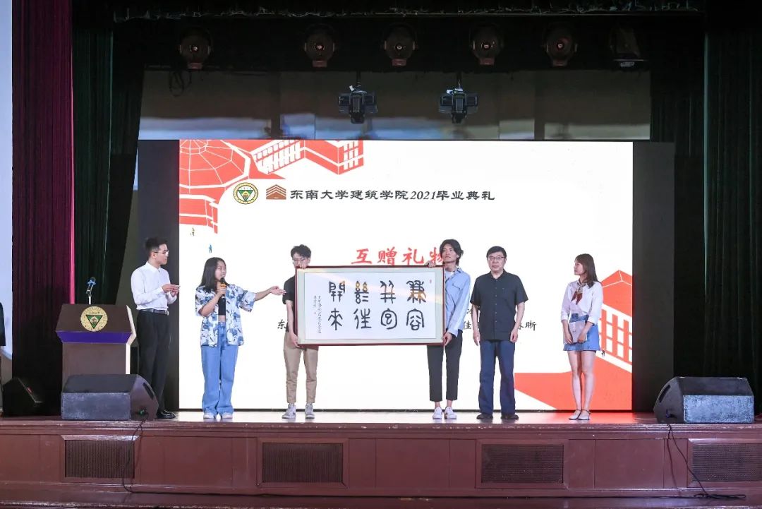 在互赠礼物环节,由2021届本科毕业生代表暴佳昕同学和硕士生代表王琳晰同学向学院赠送纪念品,学院党委书记冷嘉伟老师代表学院接收礼物,并同时为全体毕业生送上学院专属纪念品。