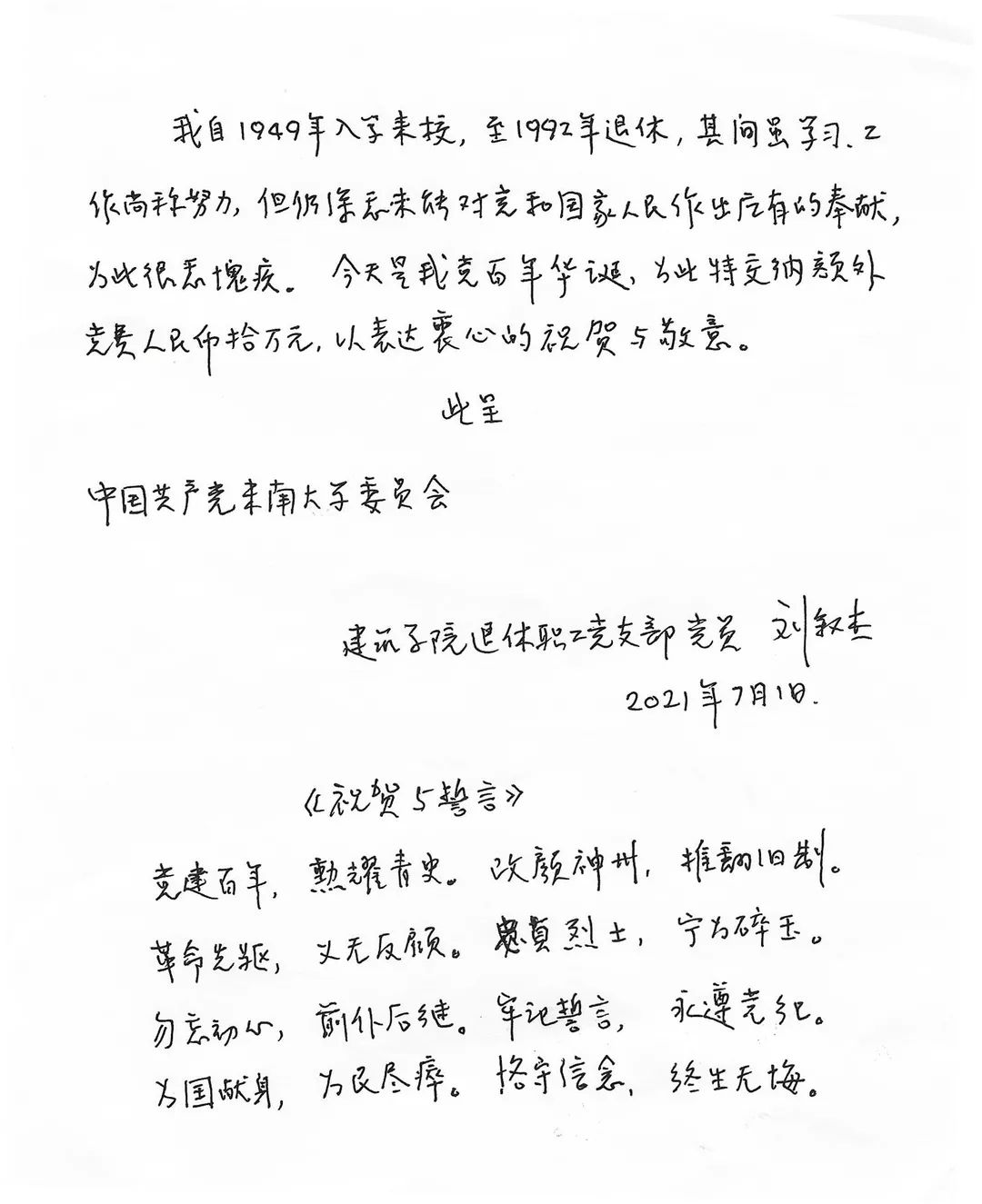 7月1日上午,庆祝中国共产党成立100 周年大会刚刚结束,万博manbetx官网 党委就收到一笔大额党费,刘叙杰同志在收看完直播后,心情十分激动,专程从家里拿出10万元积蓄上交给党组织,并亲笔书写下自己对建党一百年的祝福,用这种特别的方式庆祝党的百年华诞,感恩党的教育和培养,祝福祖国兴旺强盛。