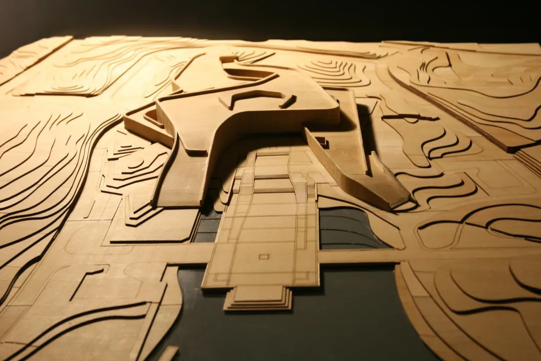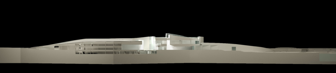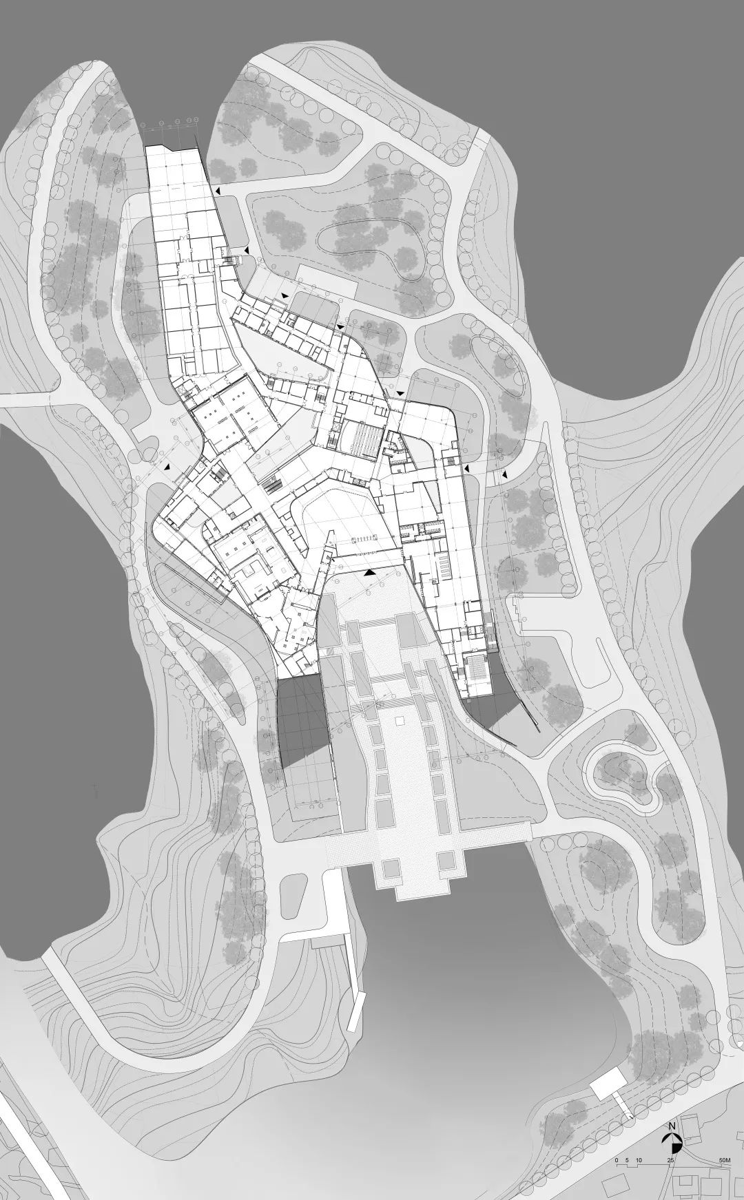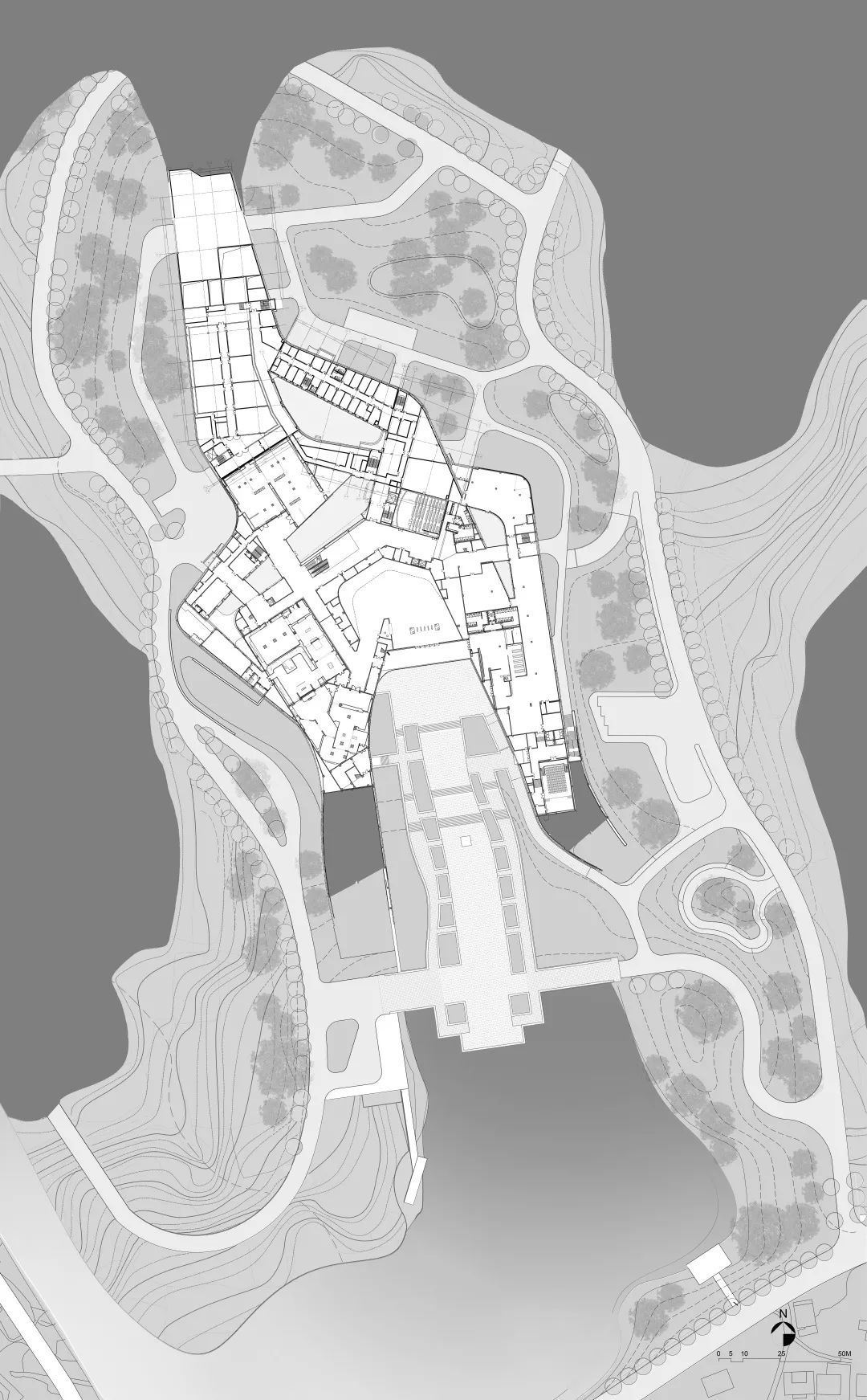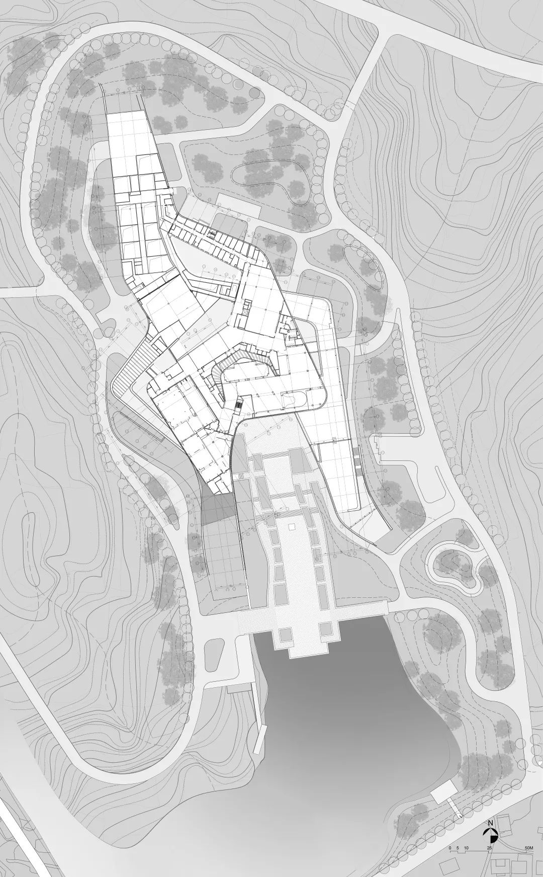 三组游动于地形之中的线性体形互为环扣,将博物馆的六大功能有序分布其中,同时组织起场馆运行的各条流线,功能机制物化于建筑形态。各组形体与地形相互交织形成的庭院为相应的建筑内部带来自然的采光和通风。