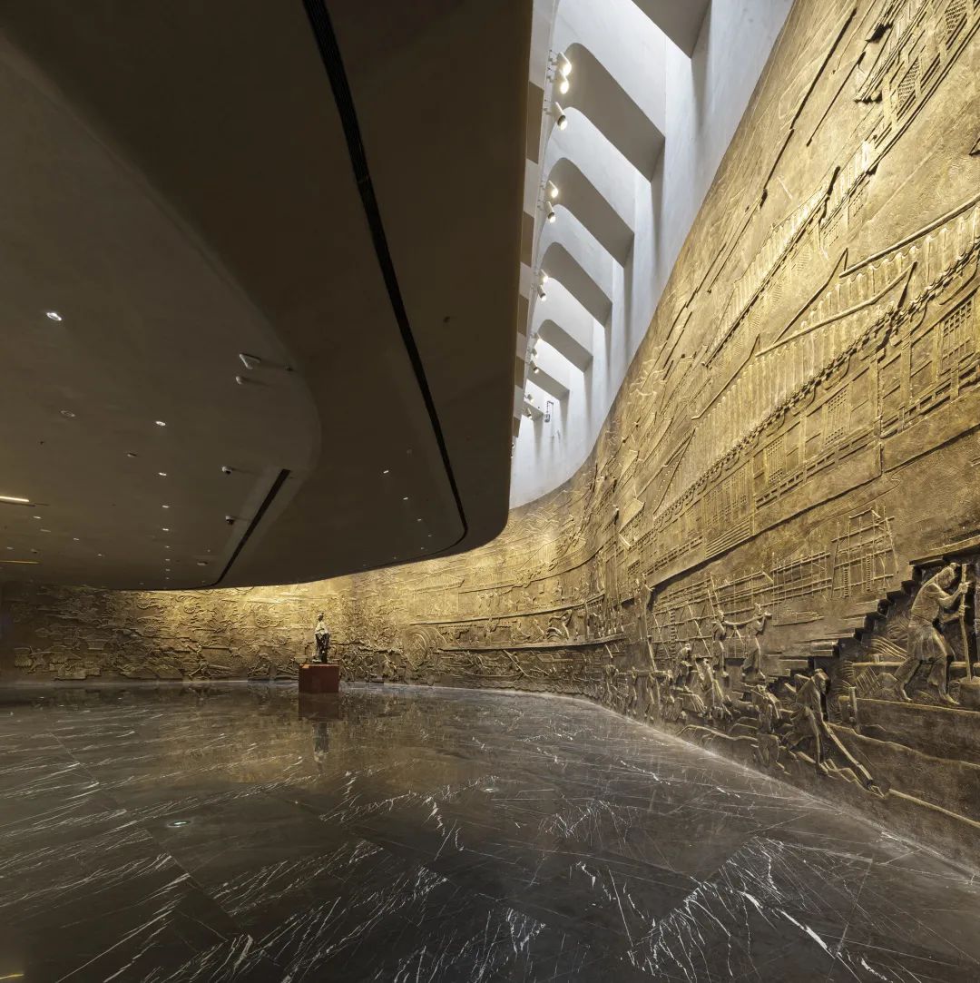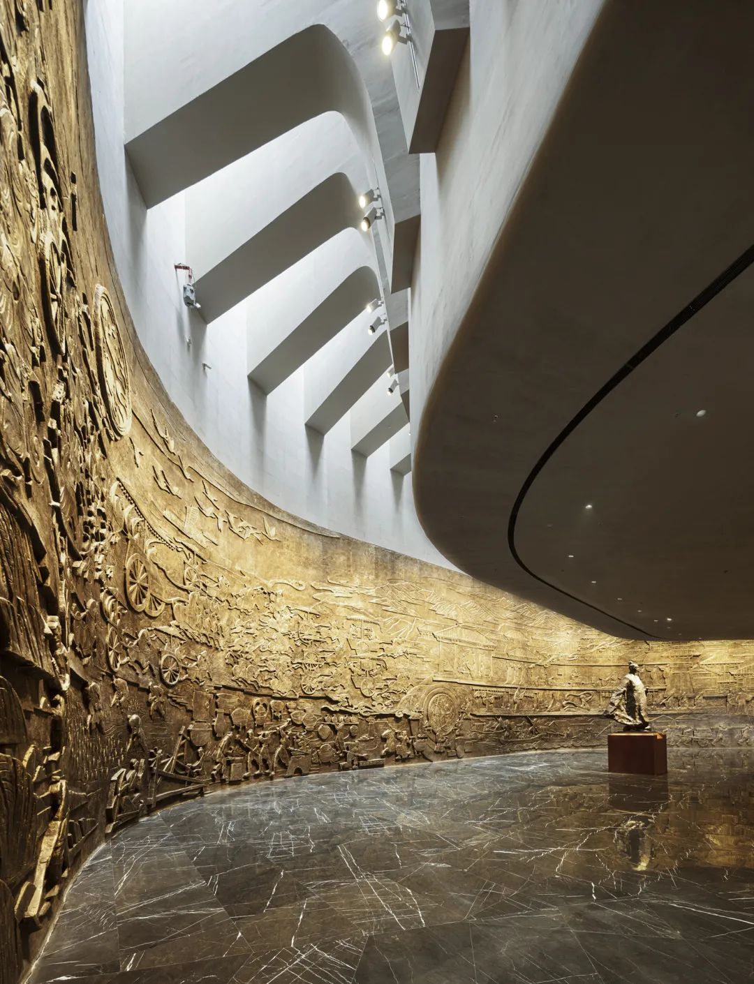 展厅以外的公共空间尽可能利用天然采光和自然通风。博物馆序厅正对主入口长达70米的铜质主题浮雕全部为天窗照亮,在幽暗空间的尽端营造出如同地质空间般的特性;电动开启的天窗,也为这个最大的无柱空间带来柔和的自然通风。建筑的线性形体在地形中的穿插生成多个庭院,在观展的间隙提供开敞的自然视景,也优化了采光与通风模式。