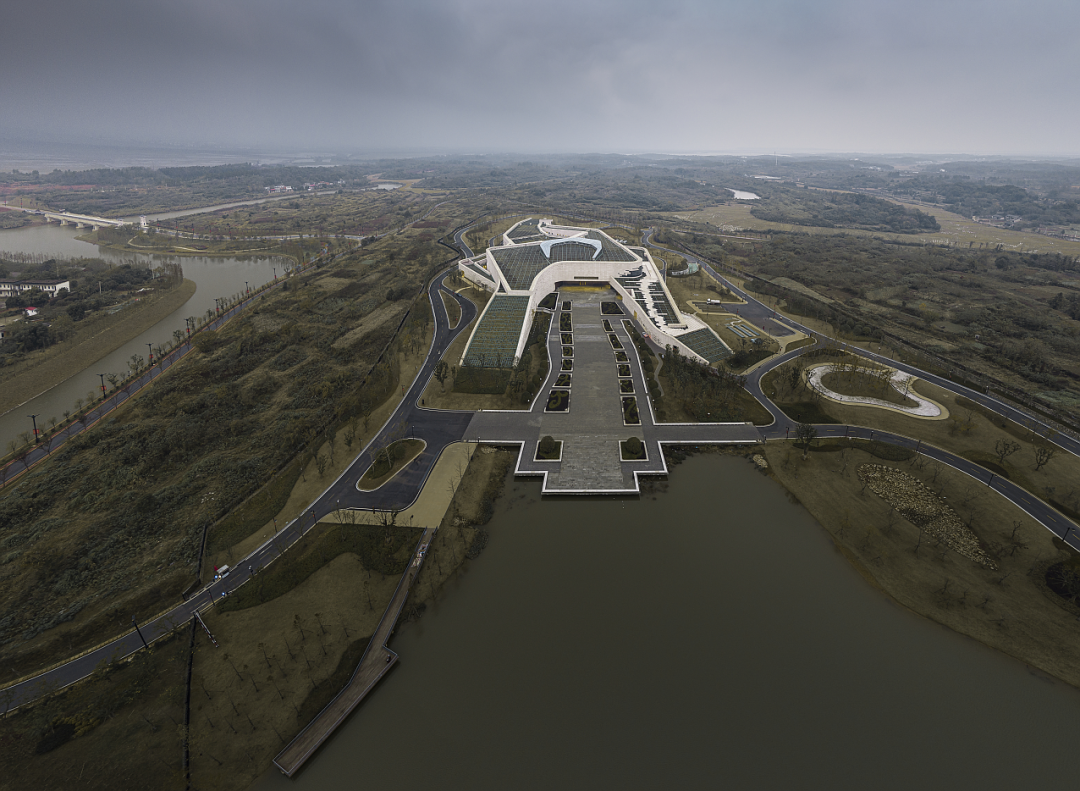 遗址博物馆设计以考古研究为依据、以遗产价值为导向。将场地与周边的岗地、水系及反映先民生活、生产方式的农耕环境视作遗址风貌组成,遵循“整体保护,最小干预”的原则,保护遗址现状地形地貌与生态原真性。以低伏的建筑形态嵌入山谷地形,以延展的主入口广场衔接湖面水系。