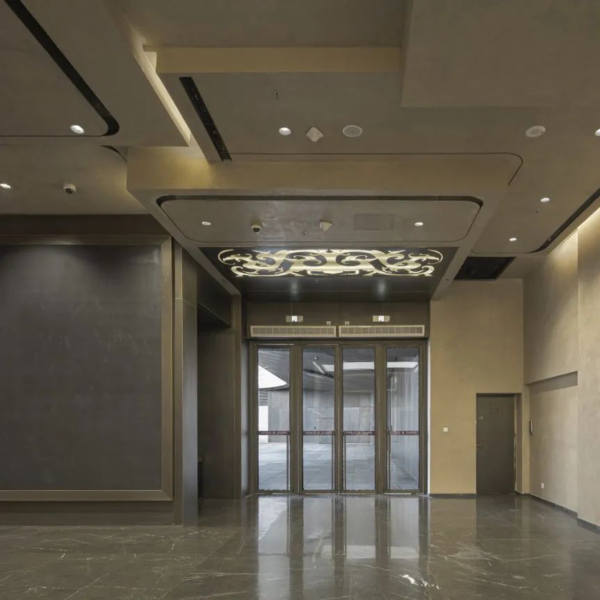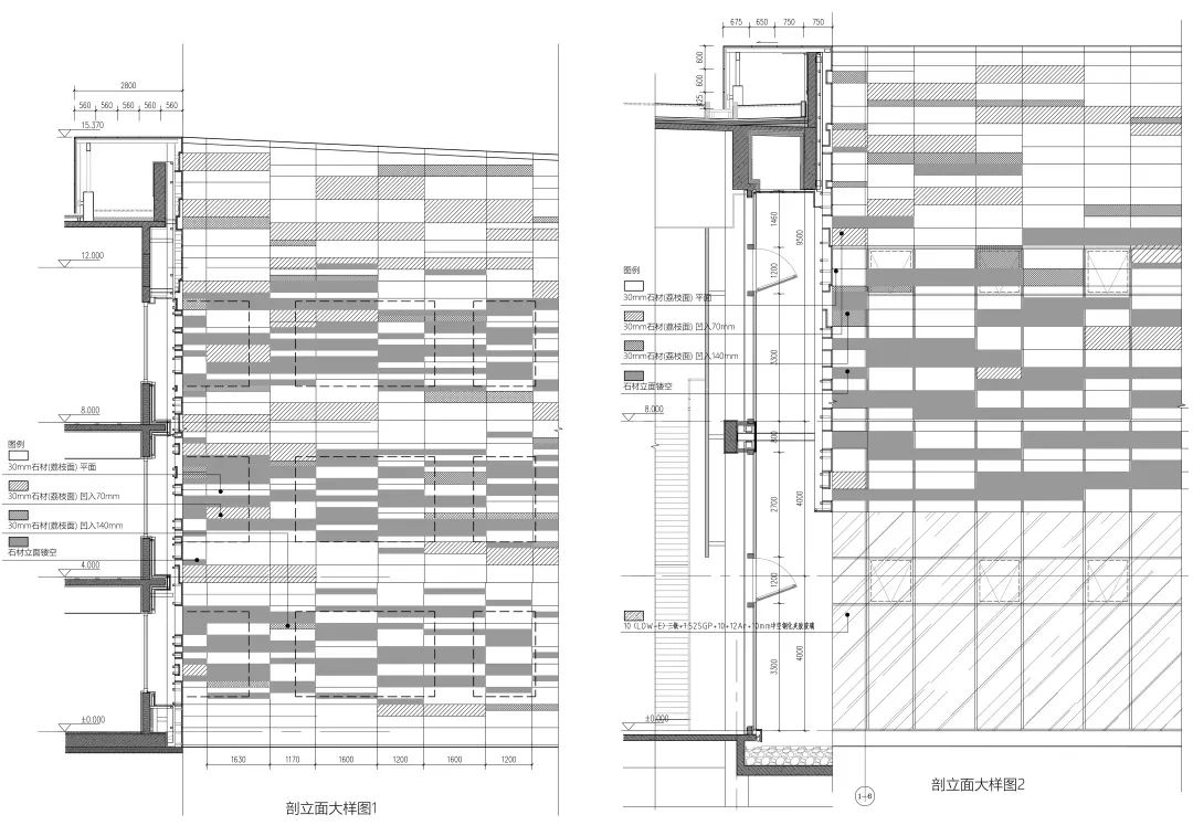 遗址博物馆全部采用干挂石材幕墙,在统一的模数控制中产生变化丰富、疏密有致的节律。在有外窗开启的功能段采用双层表皮,将幕墙与围护结构脱开,在与外窗对应的位置,以共同的设计节律开启孔洞,既实现了立面的统一和连续,又为多作东西朝向的外窗设置了遮阳,在赣北炎热的气候环境里屏蔽热辐射。