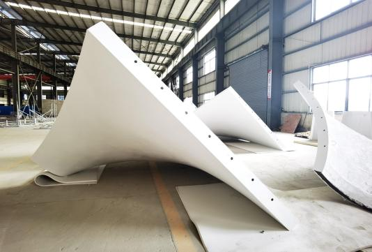 Solar Ark 3.0的UHPC材料及构件技术由江苏苏博特新材料股份有限公司赞助,壳体构件的生产在砼羽(江苏)建筑科技有限公司工厂完成,壳体构件预组装在江苏金砼预制装配建筑发展有限公司完成。屋顶造型由光滑复合双曲面生成,所有的模板肋板均为直线进行定位找形,因此加工组装速度快。
