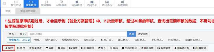 1、生源增加:在“生源信息管理”界面点击“增加”,院系审核通过,状态为“审核中”状态后,学校会定期审核,生源补报成功