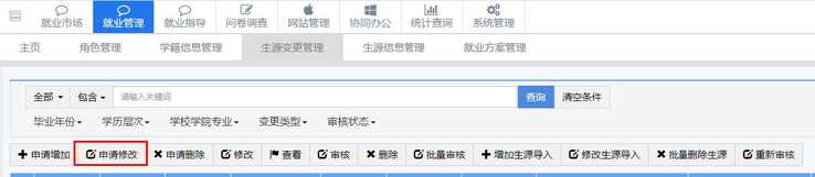 方法二:院系在“生源变更管理”点击“申请修改”(多用于办理延长学生生源,即修改毕业年份和毕业时间)