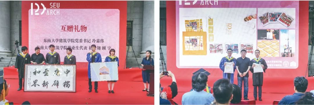 在互赠礼物环节,由2022届本科毕业生代表杨金翎同学和硕士生代表顾宇同学向学院赠送纪念品,学院党委书记冷嘉伟老师代表学院接收礼物,并同时为全体毕业生送上学院毕业文创纪念品。