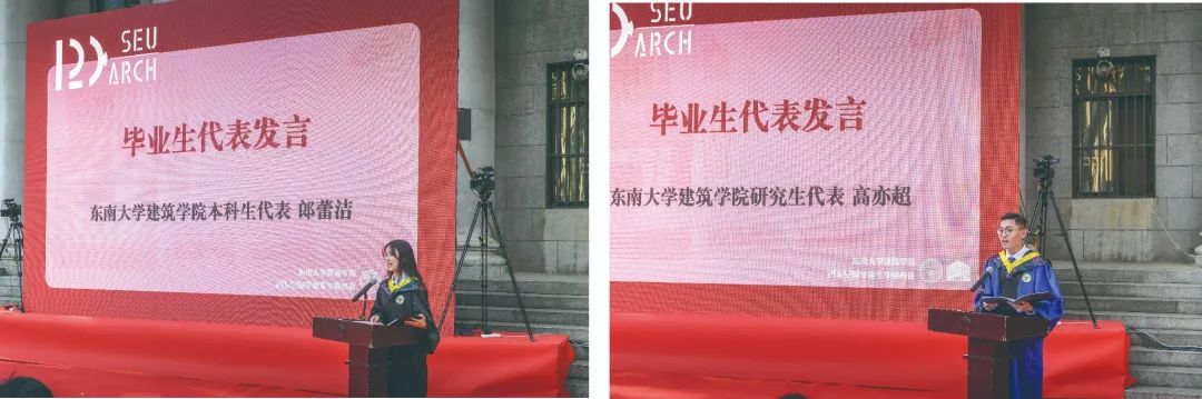随后,本科与研究生毕业生代表郎蕾洁同学与高亦超同学分别发言,在回顾学院生活的美好之余,也表达了对学院、对老师的感谢与对未来的憧憬与展望。郎蕾洁同学细数五年建院生活中的大事小事,唤起了同学们的深深共鸣。身处时代洪流之中,她祝愿同学们仍能听从内心的召唤,永远是肩上飞扬有风、心似滚烫火焰的有梦少年。高亦超同学则用东大求学八年中学到的三句话与同学们共勉。“处处留心皆学问”,学子们求学时与志同道合的伙伴一路前行、共同成长,毕业后更应接过东大前辈的先锋旗帜,成为中国建筑的领军人才。
