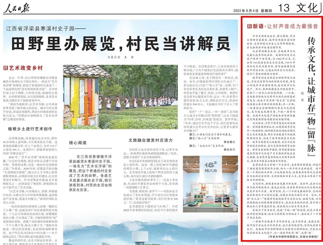 2022年8月4日,《人民日报》刊发我院段进院士的文章《传承文化,让城市存“物”留“脉”》。该文刊登在当日13版“新语”栏目中,全文如下: