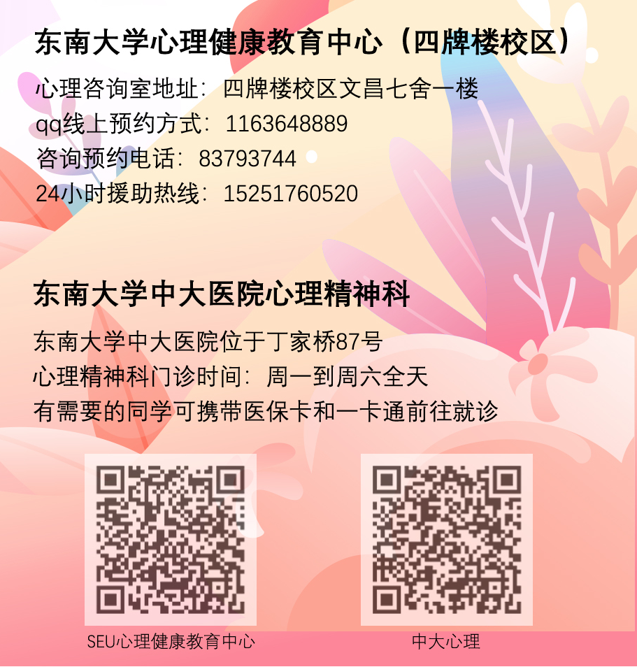 发放时间及地点:5月27日之后,通过各班心理委员发放给需要的同学,并将手册长期置于前工院519建东南大学心理健康教育中心万博manbetx官网 分中心和荟萃楼4楼活动室。