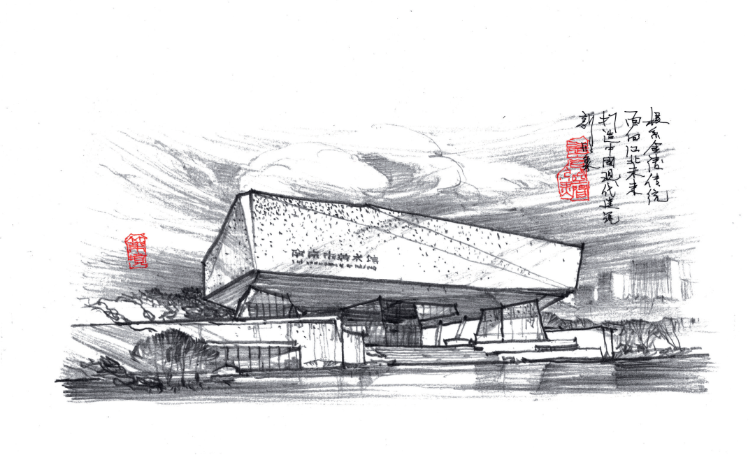 南京美术馆位于国家级江北新区商业核心区,北望老山,南眺长江,是江北地区青龙绿带上的一颗璀璨明珠。项目打破传统“艺术殿堂”的高冷形象,强调功能复合,加强美术馆的开放性,是当代文博类建筑的发展趋势。设计充分考虑这一特点,打造了一个能吸引广大市民的充满活力的公共空间。设计中,美术馆距基座18m架空,最大限度地引入了自然山水与城市景观,建筑成为全方位对外开放的立体园林。这一立体园林与以水墨画为意象的中央大厅的彩釉玻璃外墙,准确地表达了美术馆的艺术形象,更体现了一种“中国调性”。