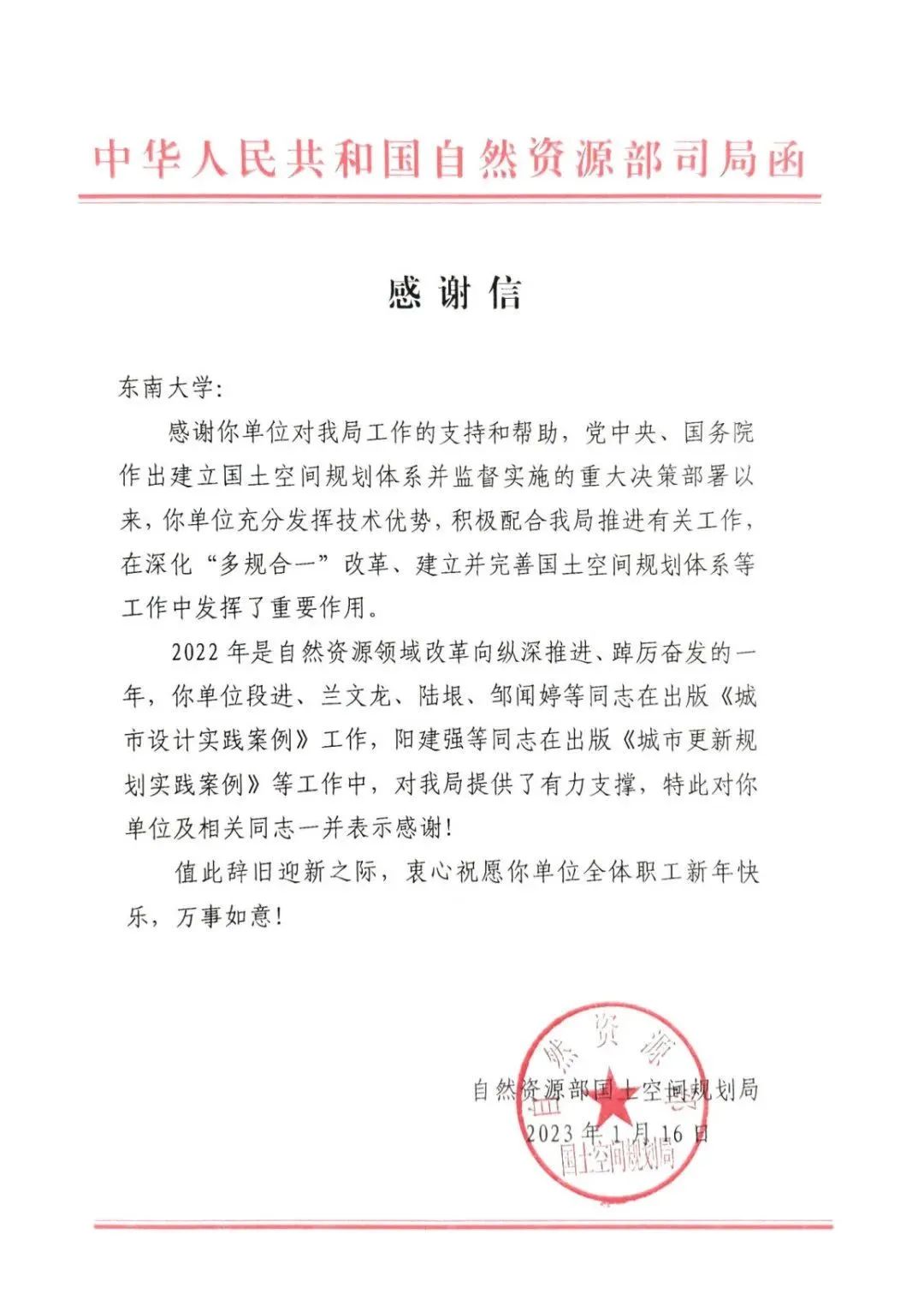 近日,东南大学收到由自然资源部国土空间规划局发来的感谢信,信中对我院长期以来支持和帮助自然资源部国土空间规划局工作,特别是党中央、国务院作出建立国土空间规划体系并监督实施的重大决策部署以来,我院充分发挥技术优势,积极配合推进,在深化“多规合一”改革、建立并完善国土空间体系等工作中发挥的重要作用表示感谢。这些工作包括:作为第一完成单位主编中华人民共和国土地管理行业标准《国土空间规划城市设计指南(TD/T 1065-2021)》,承办由自然资源部职业技能鉴定指导中心主办的首届“全国大学生国土空间规划设计竞赛”等等。其中,感谢信特别肯定并感谢了我院段进院士和兰文龙、陆垠、邹闻婷等同志在出版《城市设计实践案例》以及阳建强教授等同志在出版《城市更新规划实践案例》中对自然资源部国土空间规划局提供的有力支撑。