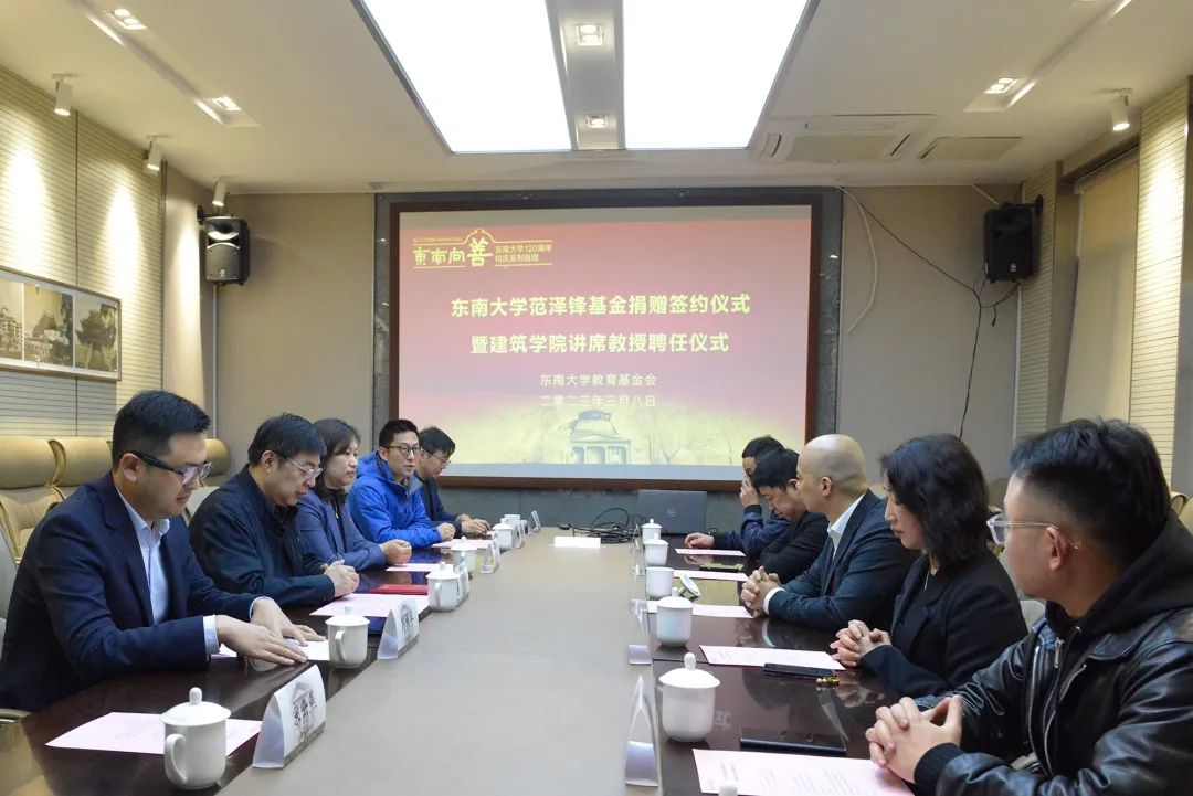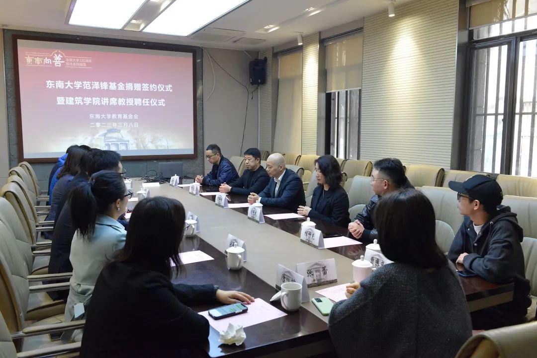 2023年3月8日上午,在万博manbetx官网 113会议室举行了“范泽锋基金”捐赠仪式,江苏省陶瓷艺术大师范泽锋携伉俪正高级工艺美术师汤先武、东南大学发展委员会副主任、教育基金会秘书长芮振华、人事处副处长何萌、万博manbetx官网 党委书记冷嘉伟、党委副书记张豪裕、院长助理唐芃等出席,仪式由万博manbetx官网 党委副书记张豪裕主持。