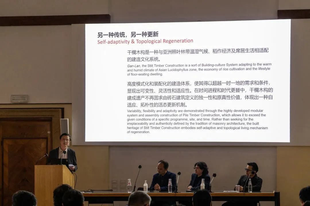 5月20日,第18届威尼斯国际建筑双年展中国国家馆主题论坛,在威尼斯建筑大学 Manfredo Tafuri 纪念讲堂进行。万博manbetx官网 院长张彤教授首先以“自适应与拓扑再生”为题,介绍了在鄂西两河口村的更新改造设计。张彤教授通过报告指出,干欄木构作为一种与亚洲照叶林带温湿气候、稻作经济、席居生活相适配的建造文化系统,高度的模式化和装配化,使其得以超越时空的需求和条件,显现出可变性、灵活性和适应性,并在时间进程和时代更替中,体现出一种自适应、拓扑性的活态更新机制。