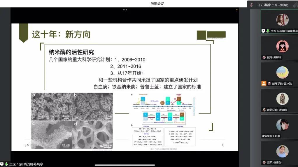 生医学院的马雨晴同学向大家介绍了纳米生物技术过去十年在医疗应用中的不断发展,为医疗诊治所作出的重要共享,然后展望了未来的发展方向。