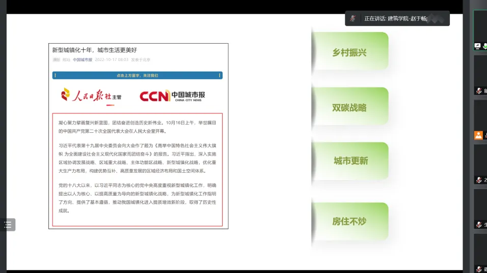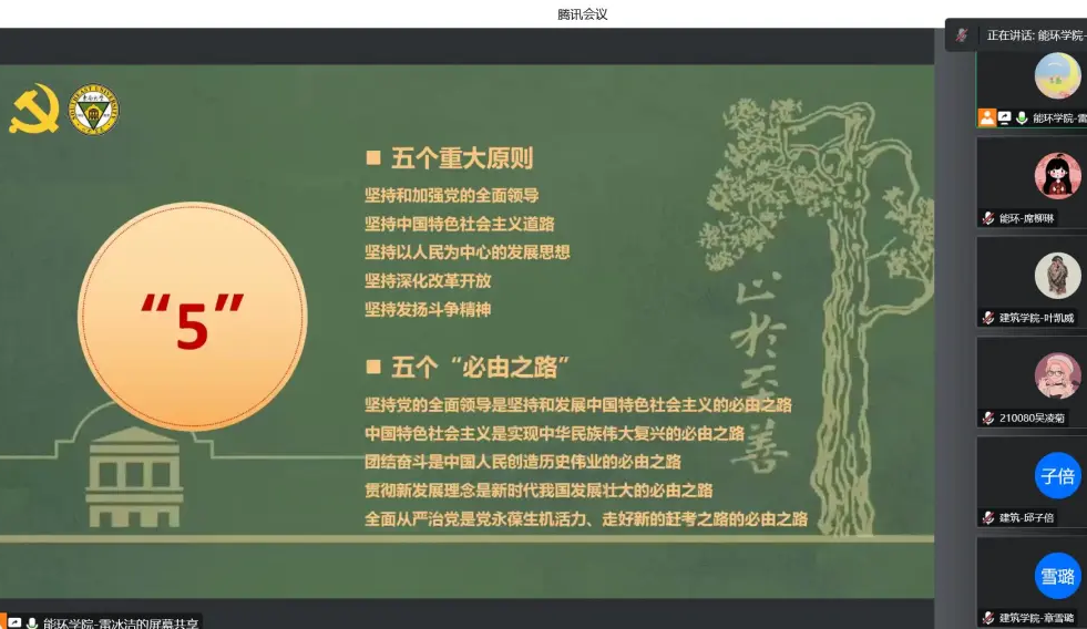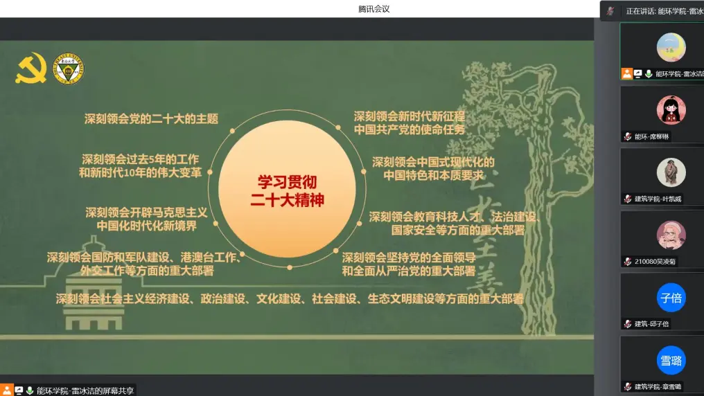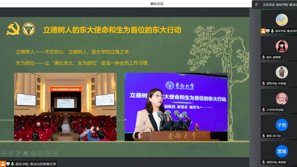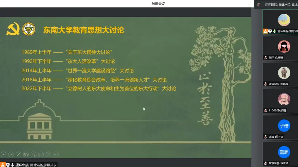 为更好地立足新阶段、围绕新要求、展现新作为,充分汇聚智慧、更新观念、凝聚共识,实现东大人才培养工作的再次腾飞,以优异成绩迎接党的二十大胜利召开,我校于10月7日上午正式启动以“立德树人的东大使命和生为首位的东大行动”为主题的新一轮教育思想大讨论,作为东大学子,充分学习并参与到讨论中既是权利也是义务。因此,由能源与环境学院硕士生第10党支部支部书记雷冰洁带领同学们学习了东南大学教育思想大讨论历届背景和主题、及本次主题的深刻内涵,以此让同学们更好地在本轮教育思想大讨论中贡献自己的想法和力量。