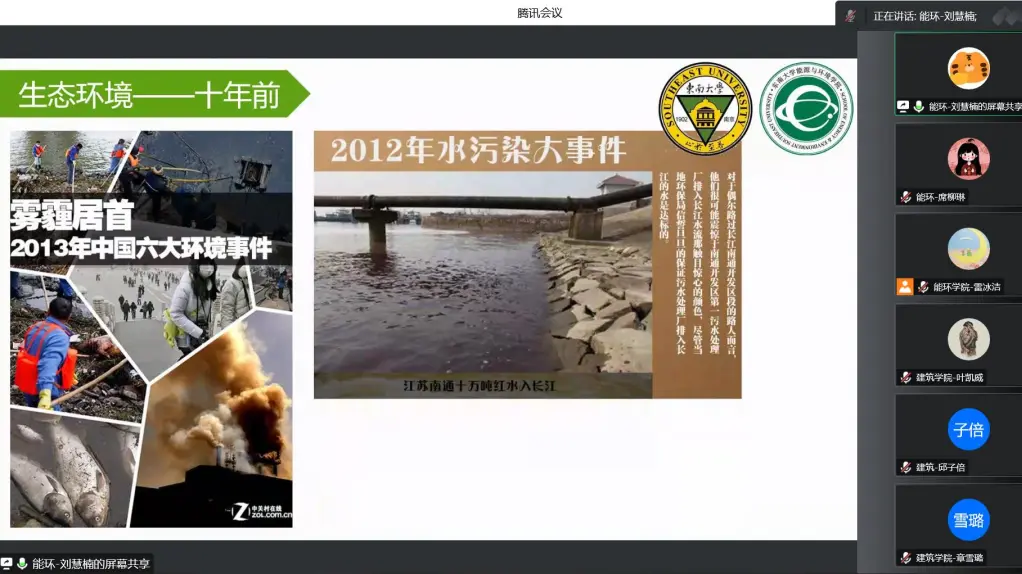 能源与环境学院的刘慧楠同学就环境工程专业进行了一个简要介绍,然后展示了十年间我国生态环境发生的巨大转变,我国生态文明建设取得的重大成就,最后就专业未来的发展进行了展望。