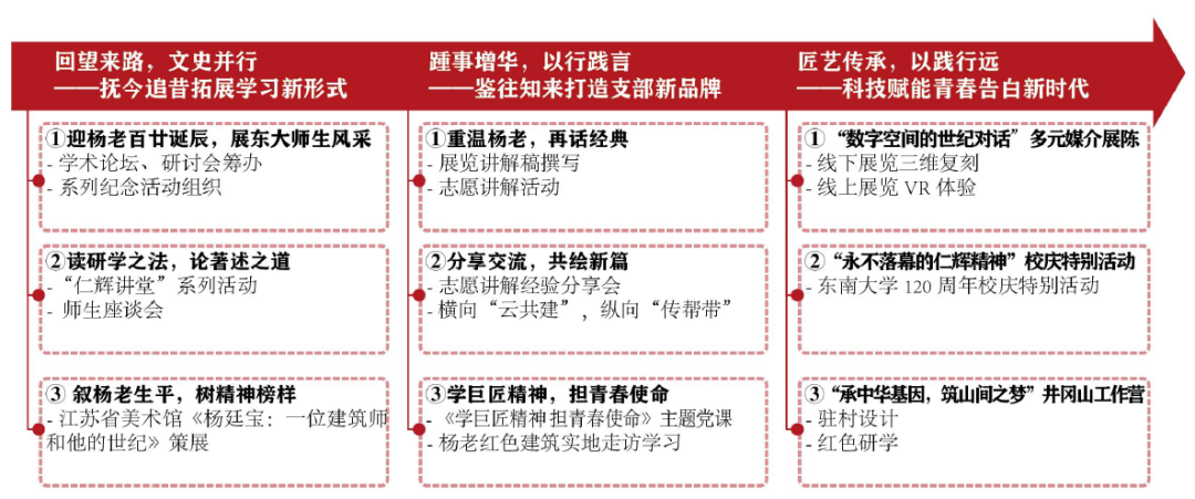 2021年是中国建筑教育的一代宗师、近现代中国建筑第一人、东南大学建筑系创始人杨廷宝先生诞辰120周年。为纪念杨廷宝为新中国建筑事业和高等教育事业做出的卓越贡献,2021年11月起,在东南大学举办了一系列学术论坛、研讨会、《杨廷宝全集》首发式、“杨廷宝:一位建筑师和他的世纪”展览等纪念活动和学术活动。建筑学硕士生五党支部、建筑设计博士生党支部、建筑系党支部围绕杨老诞辰120周年和东南大学建校120周年共同开展系列党日活动,共分为回望来路、文史并行,踵事增华、以行践言,匠艺传承、以践行远三大篇章。