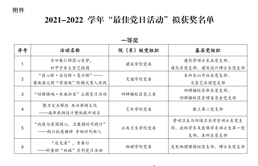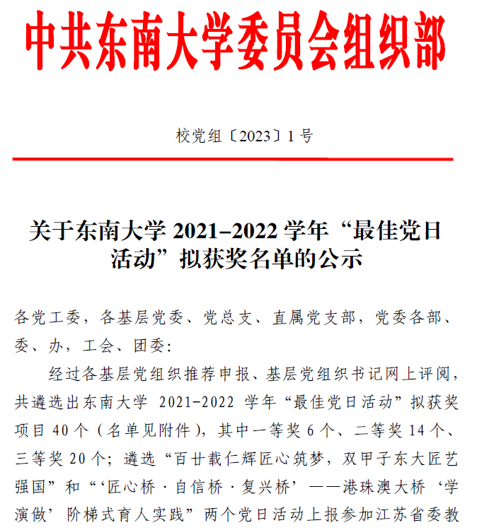 近日,东南大学2021-2022学年“最佳党日活动”评选结果揭晓,我院建筑学硕士生五党支部、建筑系党支部、建筑设计博士生党支部共同开展的“百廿载仁辉匠心筑梦,双甲子东大匠艺强国”主题党日活动荣获东南大学2020-2021学年 “最佳党日活动”一等奖,并将上报参加江苏省委教育工委组织的2022年度全省高校“最佳党日活动”优胜奖评比。