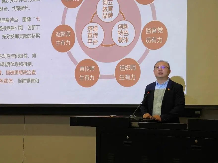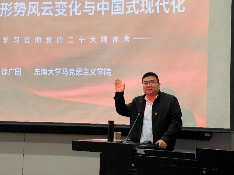上午,东南大学马克思主义学院徐广田老师给师生党员作《国际国内形势风云变化与中国式现代化——学习贯彻党的二十大精神》辅导报告,从“中国式现代化的风险挑战”、“中国式现代化的理论体系”、“大力推进中国式现代化”三个方面,深刻解读了“中国式现代化”的丰富内涵,既有深度,又有广度,为师生党员进一步深刻理解和准确把握党的二十大精神,特别是认识中国式现代化的内涵要义提供了思路和指导,帮助师生党员凝聚起基层党支部现代化建设的思想力量。