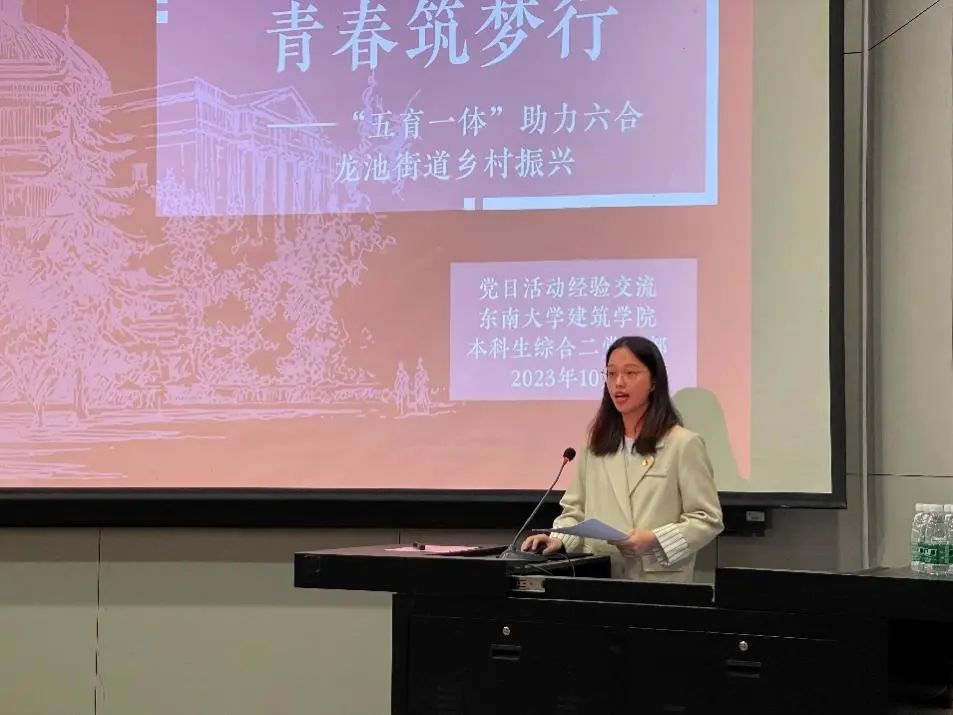 建筑学硕士生五党支部书记许凌子围绕江苏省高校最佳党日活动优胜奖《百廿载仁辉匠心筑梦 双甲子东大匠艺强国》进行经验分享。支部基于杨廷宝诞辰120周年和东南大学建校120周年设计开展一系列历史梳理、实地调研、志愿服务、经验分享、主题党课、师生座谈、虚拟展厅、摄影绘画、知识竞赛等主题党日活动,以专业促进新时代党员培养,以机制挖掘研究生支部潜力。