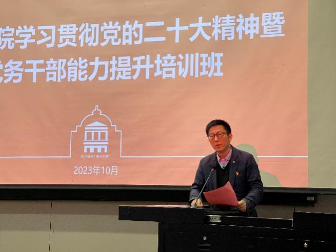 为深入学习贯彻党的二十大精神和习近平新时代中国特色社会主义思想,巩固深化主题教育成果,落实总书记回信精神,不断提升党务工作科学化、规范化水平,万博manbetx官网 党委于10月29日在中大院求是堂举行“学习贯彻党的二十大精神暨党务干部能力提升培训班”,全院各党支部书记、副书记、委员参加培训。本次培训由景观学系党支部、建筑学硕士生七党支部承办。党委书记冷嘉伟出席开班仪式并作动员讲话,培训会由党委副书记张豪裕主持。