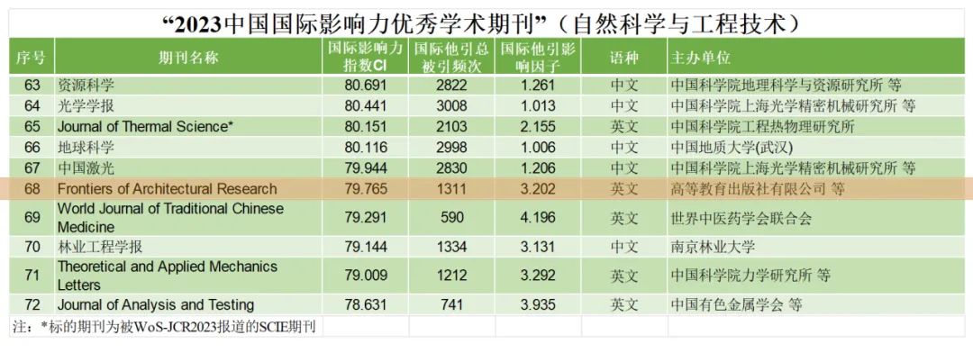 共计175种科技类学术期刊入选“中国国际影响力优秀学术期刊(自然科学与工程技术)”。其中,Frontiers of Architectural Research 期刊排名第68位,与去年同比上升了27个位次。