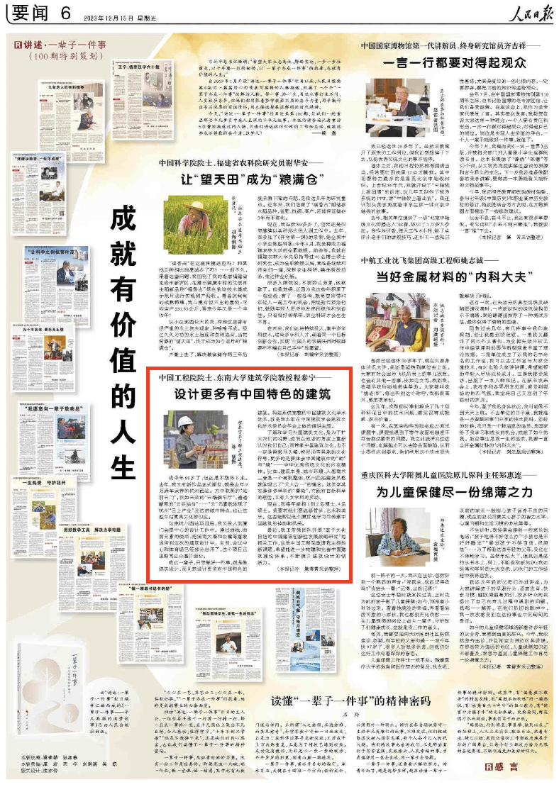 2023年12月15日,《人民日报》06版要闻、13版记者调查分别报道了万博manbetx官网 程泰宁院士数十年投身于建筑设计以及万博manbetx官网 团队改造老街区的故事。