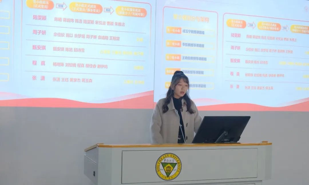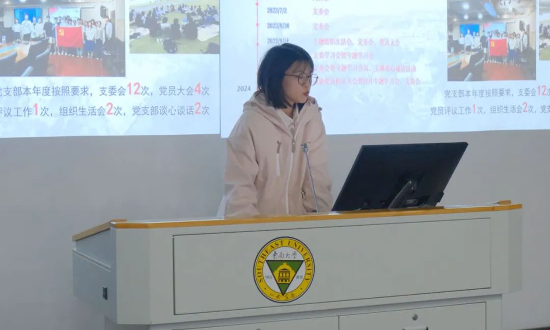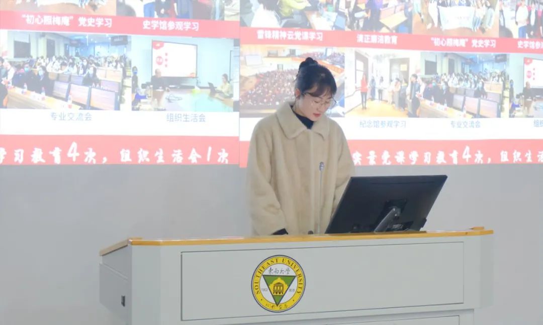 在雄壮轩昂的东南大学校歌中,活动正式拉开序幕。活动的主要议程包含:支部书记述职与党日活动立项汇报内场活动和“新党员入党宣誓,老党员重温入党誓词”外场活动两项环节。活动由院研究生会团委实践部部门成员崔澳同志主持。