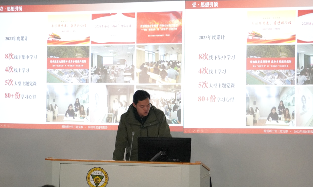为进一步加强党员思想教育,提升学生党员党性意识和修养,坚定党员入党初心,擦亮党员过硬底色,万博manbetx官网 研究生党支部书记述职活动于2024年1月5日下午在四牌楼校区东南院102大阶梯教室顺利举办,各研究生党支部齐聚一堂,共话支部建设,汇报交流支部建设事务性工作与最佳党日活动院内培育项目立项情况,并同步开展“新党员入党宣誓,老党员重温入党誓词”活动,作为“重温·信仰”大型党建系列的活动收官。本次活动由院研究生会团委实践部与党建助手团队联合承办。