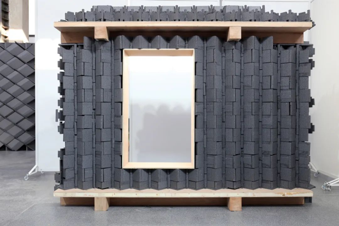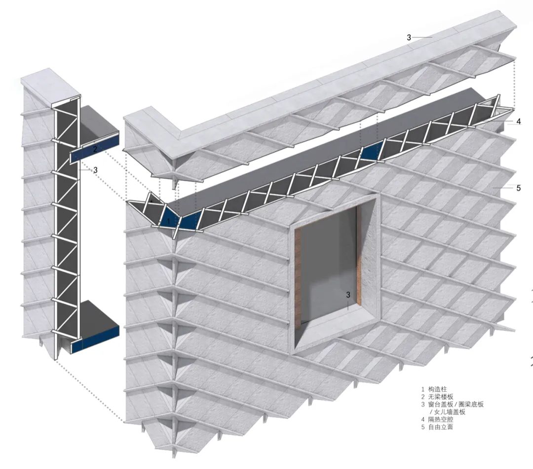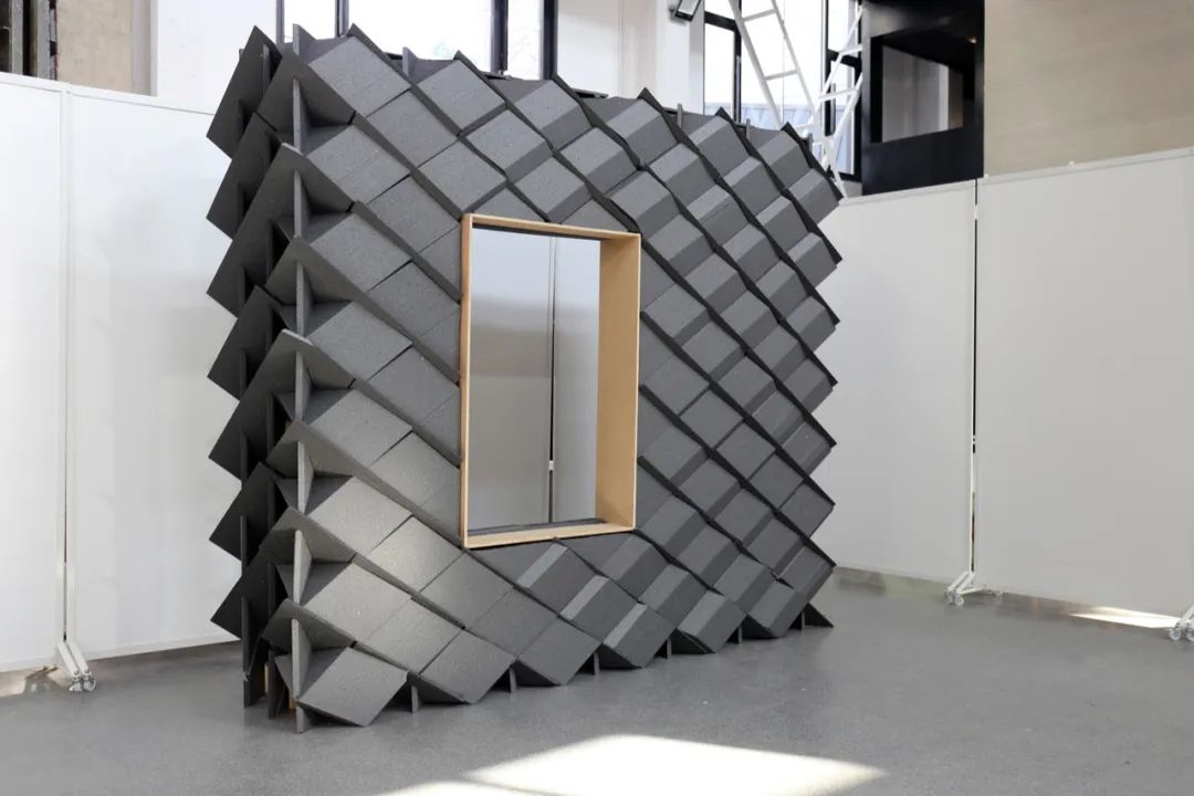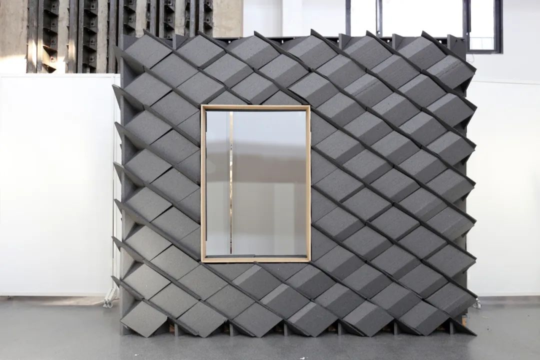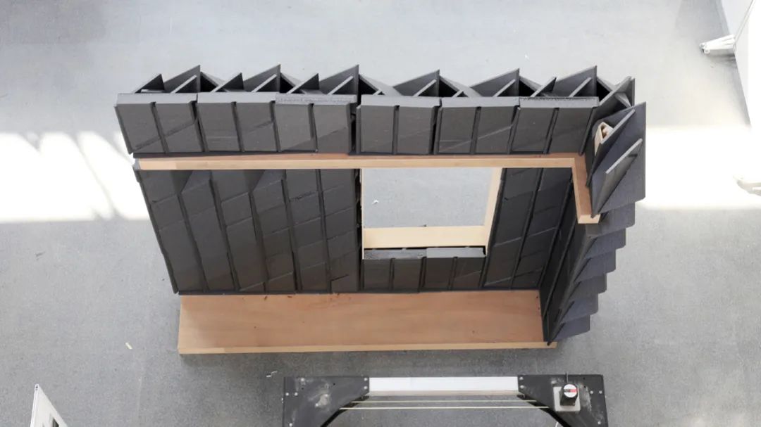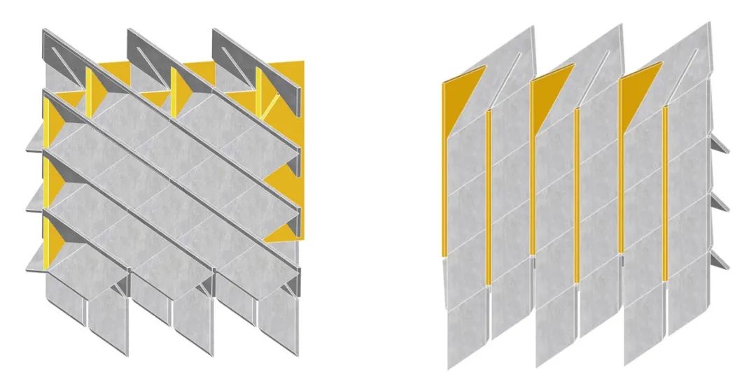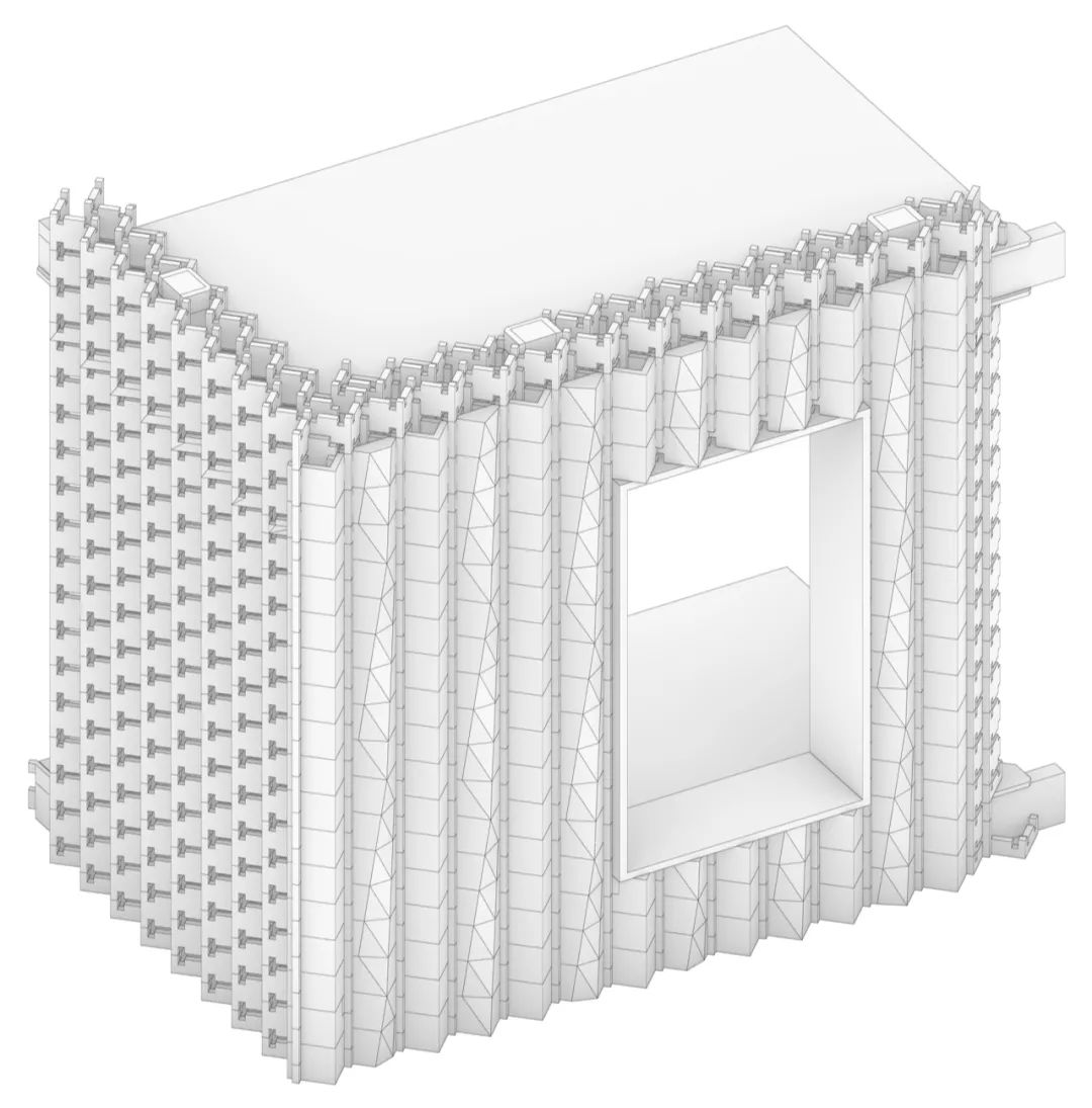 在墙厚度方向增加折板数量,形成空隙,也加强了整体结构稳定性。利用多层穿插的几何特征,形成转角处构造。为了造就多个互不贯通的内部空腔,增设了水平隔板构件,隔断既有的竖向贯通空腔。