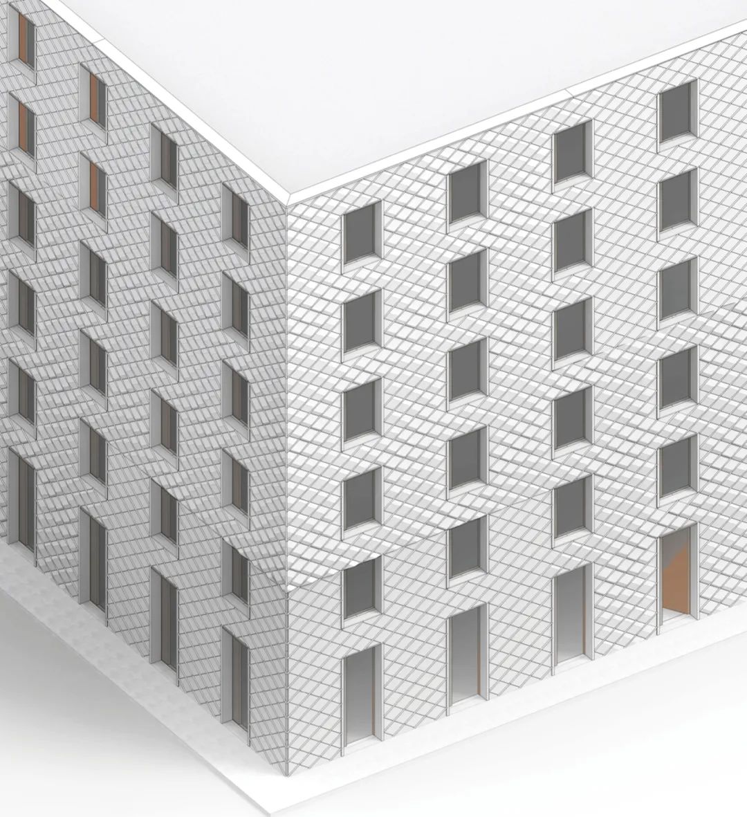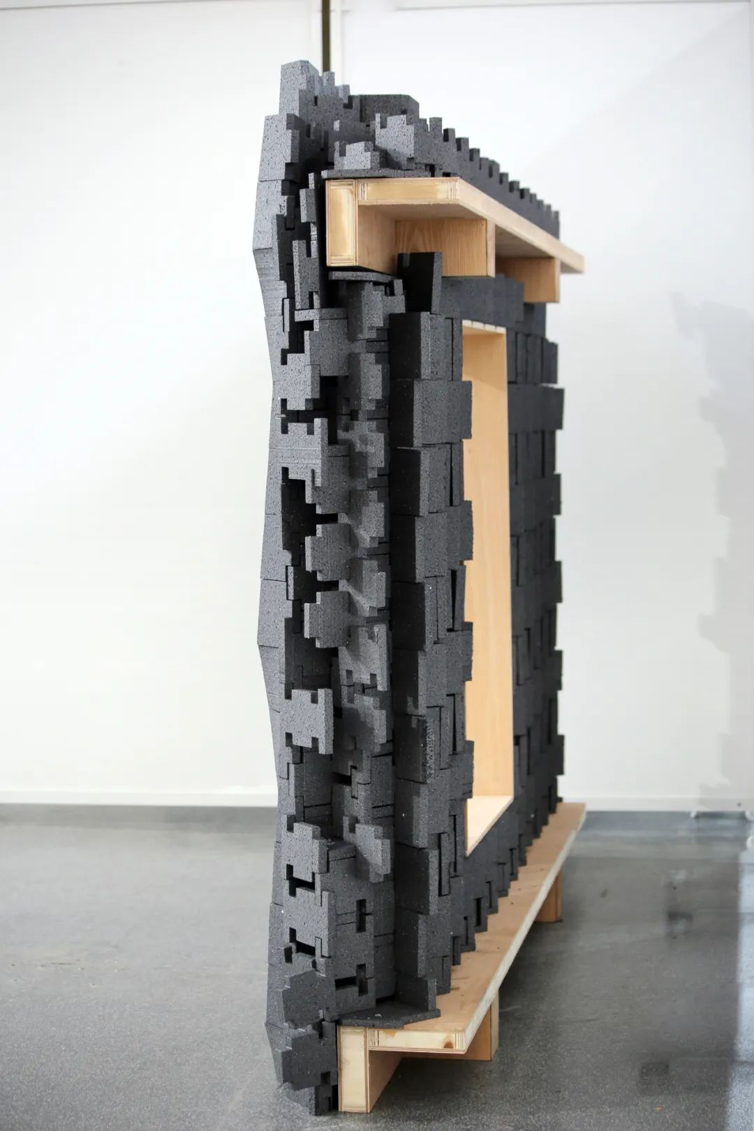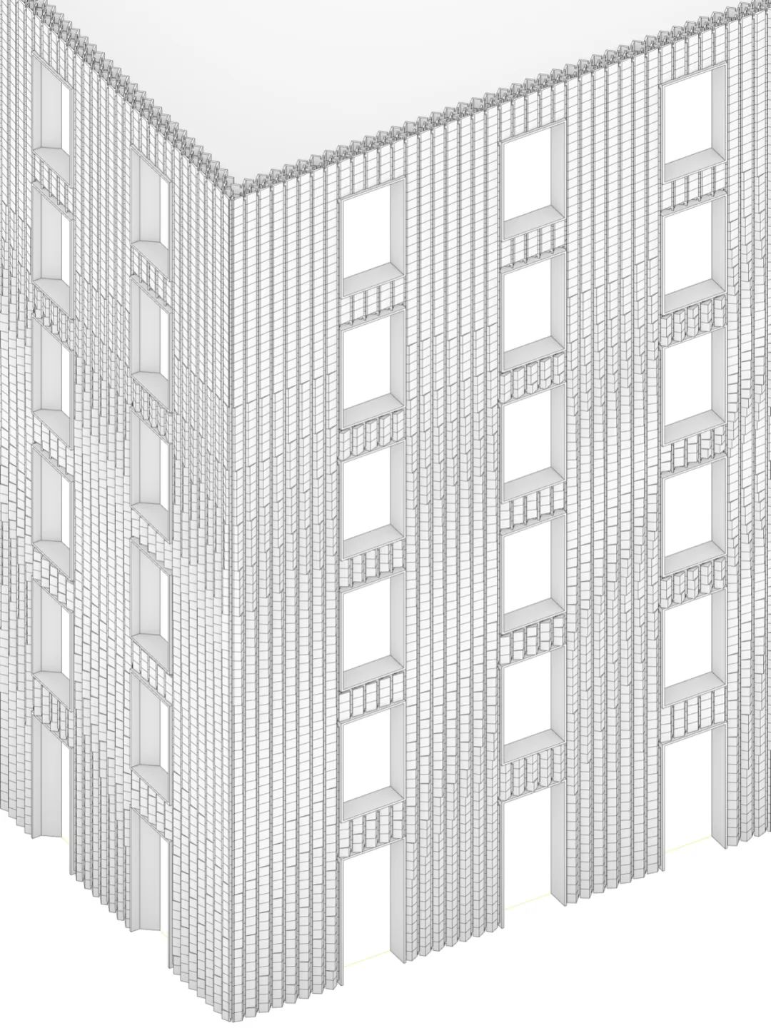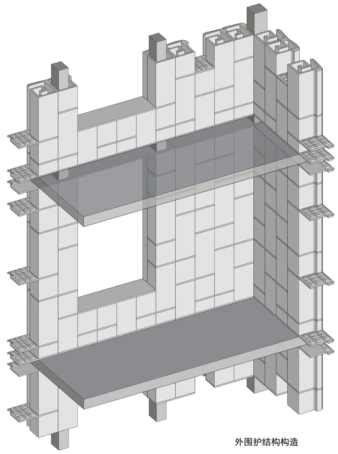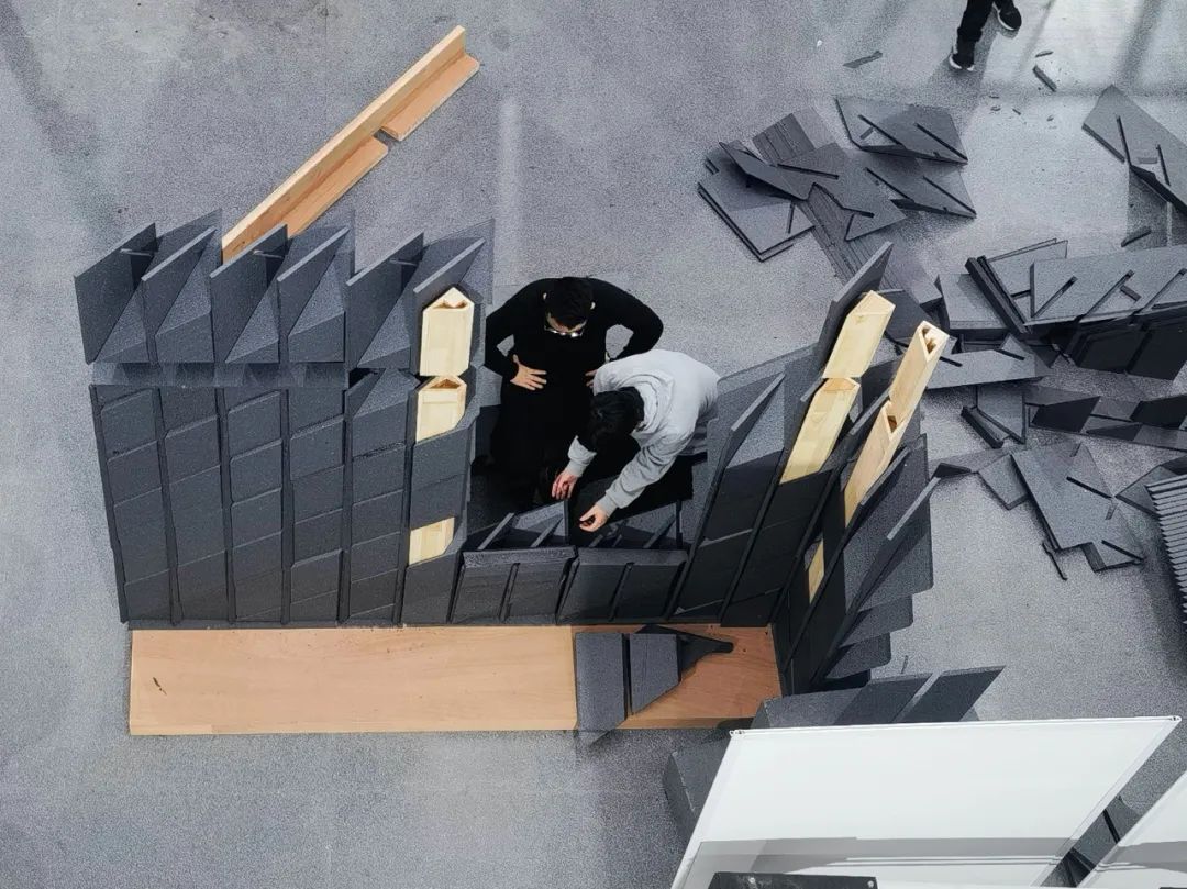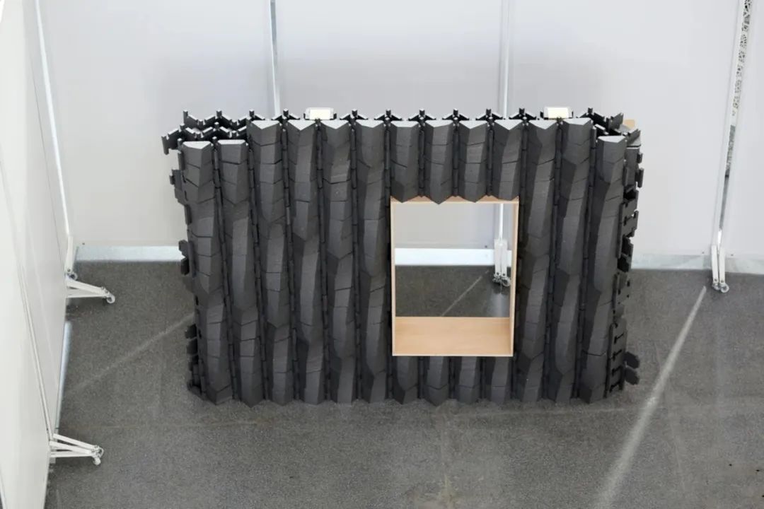 在墙厚度方向增加折板数量,形成空隙,也加强了整体结构稳定性。利用多层穿插的几何特征,形成转角处构造。为了造就多个互不贯通的内部空腔,增设了水平隔板构件,隔断既有的竖向贯通空腔。