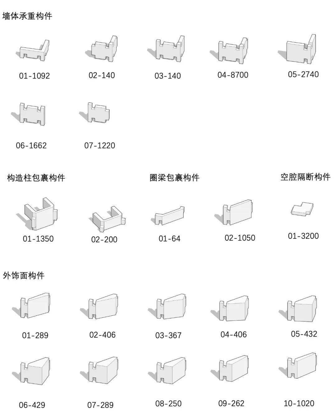 墙体结构由3类砌块组成。内部联系砌块竖直居中,内外侧墙体砌块嵌入其中,形成基本结构单元。3单元相连可形成更整体的砌块,加快搭建效率。兼顾美学与结构合理性,内侧呈竖直分缝便于装修,外侧呈斜向菱形。内墙砌块又细分为2连与3连两种,互相骑缝,适应不同长度的墙体。
