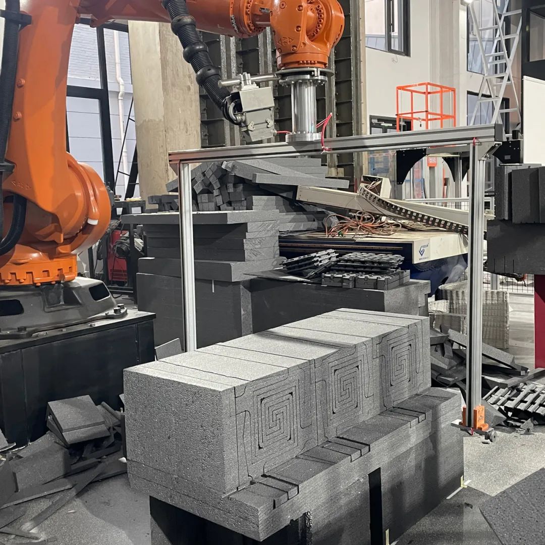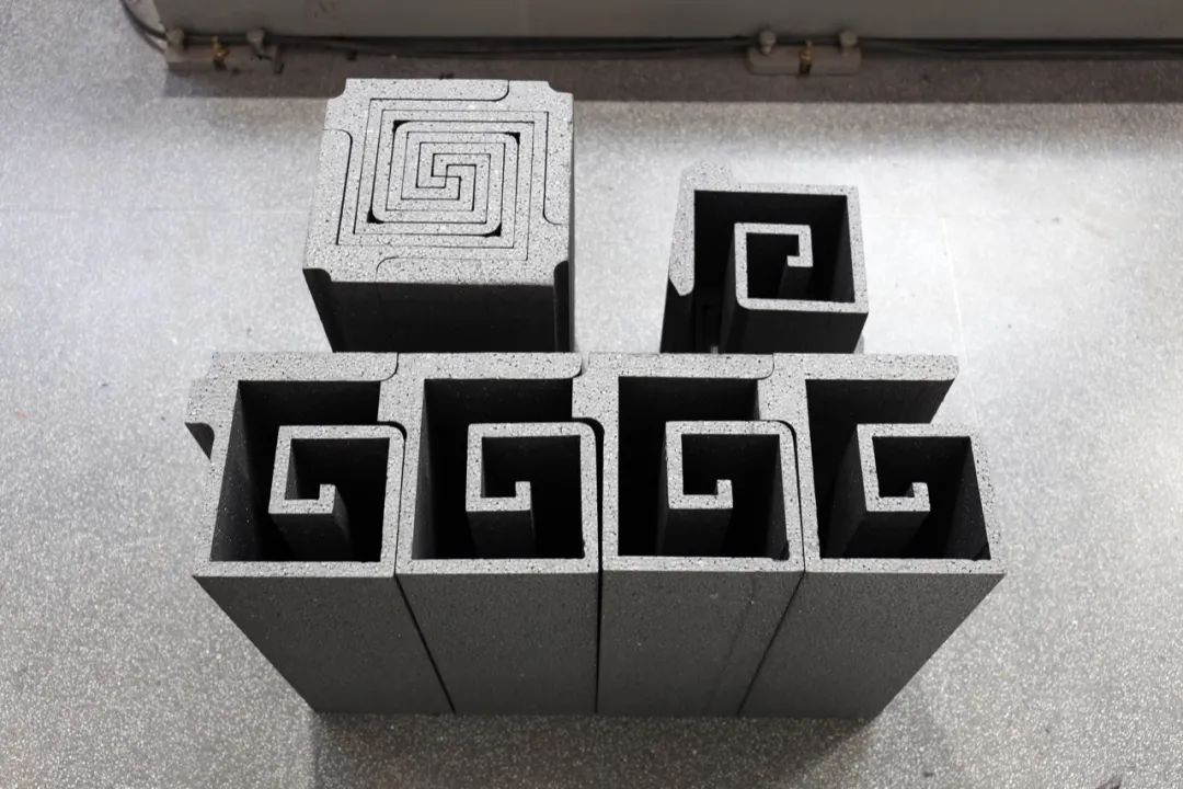 利用砌块外侧的几何自由度,在整个建筑立面上形成流动式的正弦曲线图案。采用参数化的建模方式对建筑的所有砌块进行批量化建模,并输出机器人线切割路径,实现批量化的定制生产。