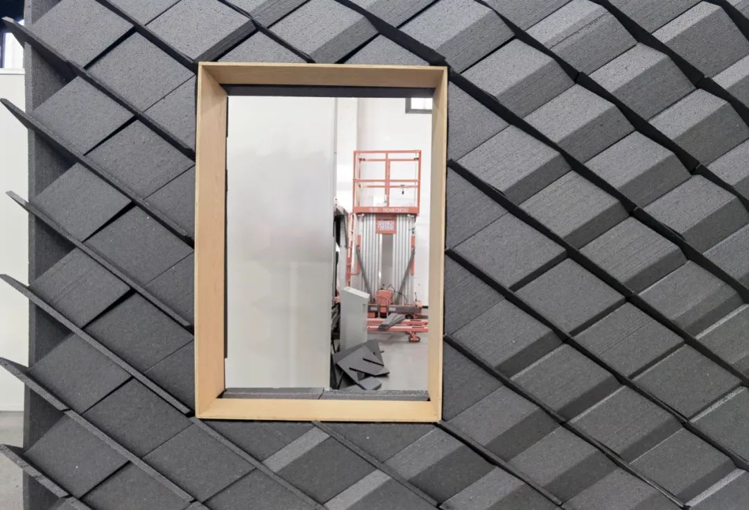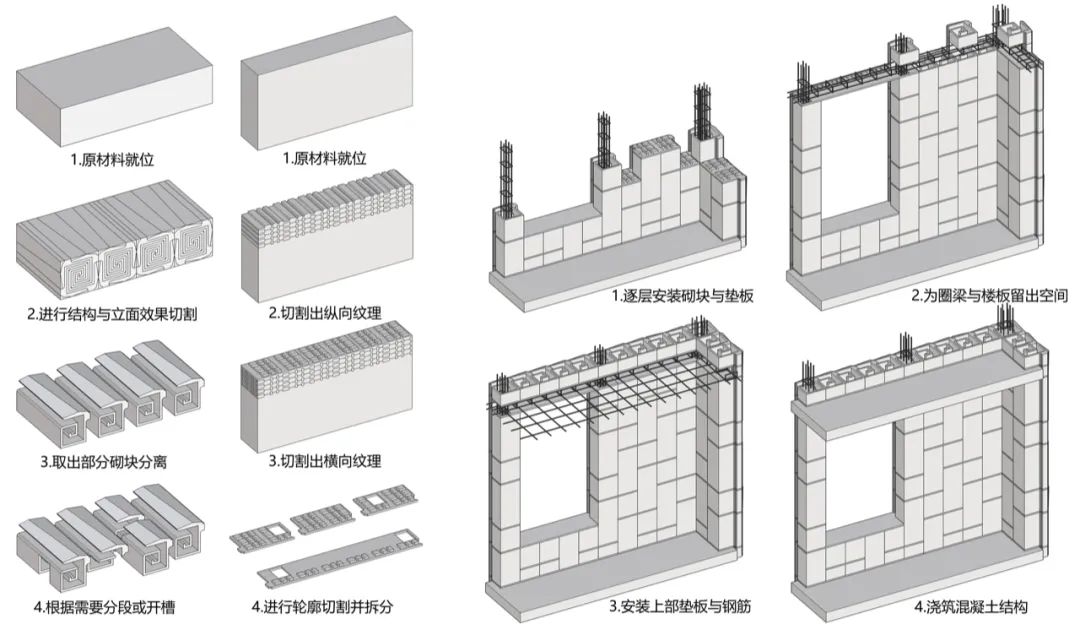 机器人批量线切割L型砌块分为两道工序。首先把L型长条(长1.2米)轮廓密排在1.2*1.2*2.4m原材料方块中,尽量减少边角料。然后把得到的L型长条重新排列成矩形正交结构,机器人再进行线切割,把L型长条切分成多个L型砌块同时造就了每个L型砌块上的槽口。除了基本的L型砌块,用来围合构造柱的砌块、圈梁包裹构件也采用了类似的工序。墙体外侧的几何形状可以定制而不影响连接构造,为立面装饰提供了可能。