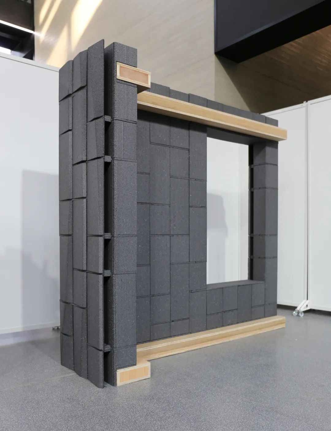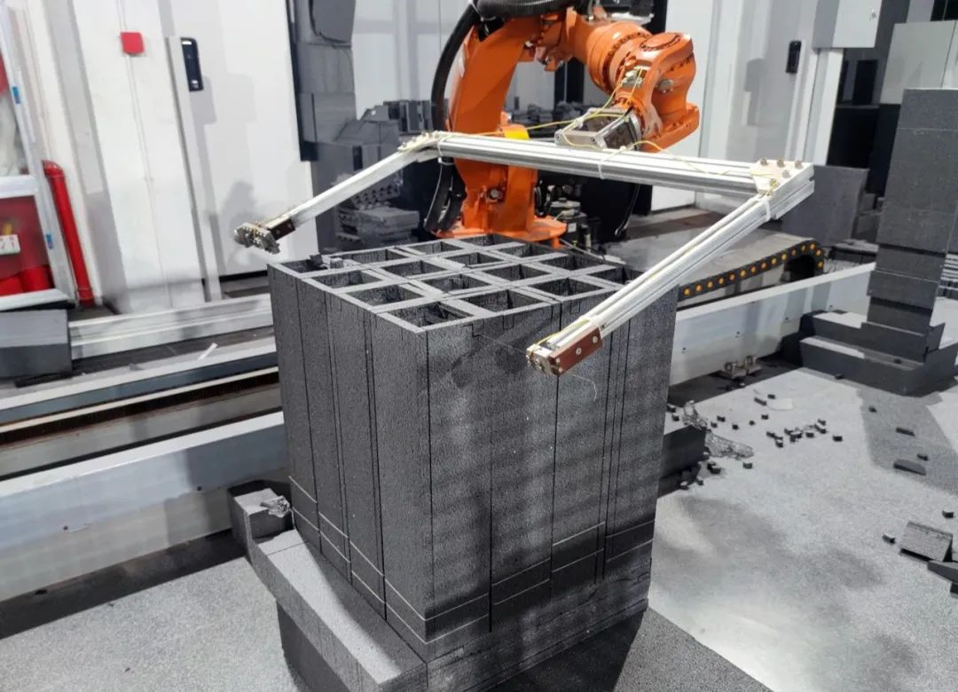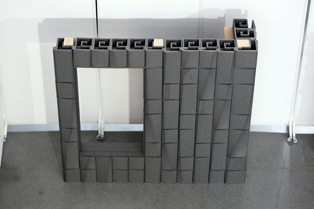 设计任务为2226办公楼的外围护结构设计一种新的构造形式与建造工艺,个性化的砌块由线切割工艺制造。墙体每隔2-4米设现浇混凝土构造柱,与圈梁、混凝土楼板等一起构成稳定的建筑结构。墙厚小于0.65m。原材料(大型轻质发泡块材)尺寸为1.2*1.2*2.4m。制造砌体结构的局部1:2模型,砌块之间无粘结剂。用机器人批量热线切割EPS塑料形成模型的砌块,用木材代表混凝土部件(楼板、圈梁、构造柱)。
