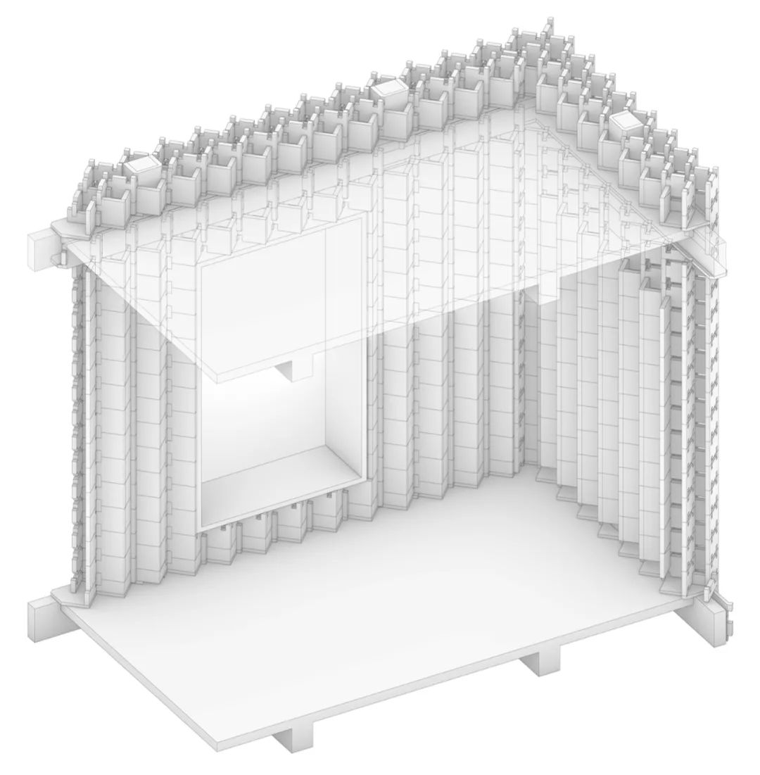 定制化的横板增强了砌块之间的垂直与水平连接。一长一短的砌块组合(立面上呈L形)与横板共同构成了一个弱互锁体系,有利于干砌式结构的稳定性。部分砌块内部留出用于浇筑构造柱的空间。另一部分砌块水平切割出凹槽,与横板一同组成圈梁模板。转角处为正方形截面的特殊砌块,适应两个方向墙面的厚度。