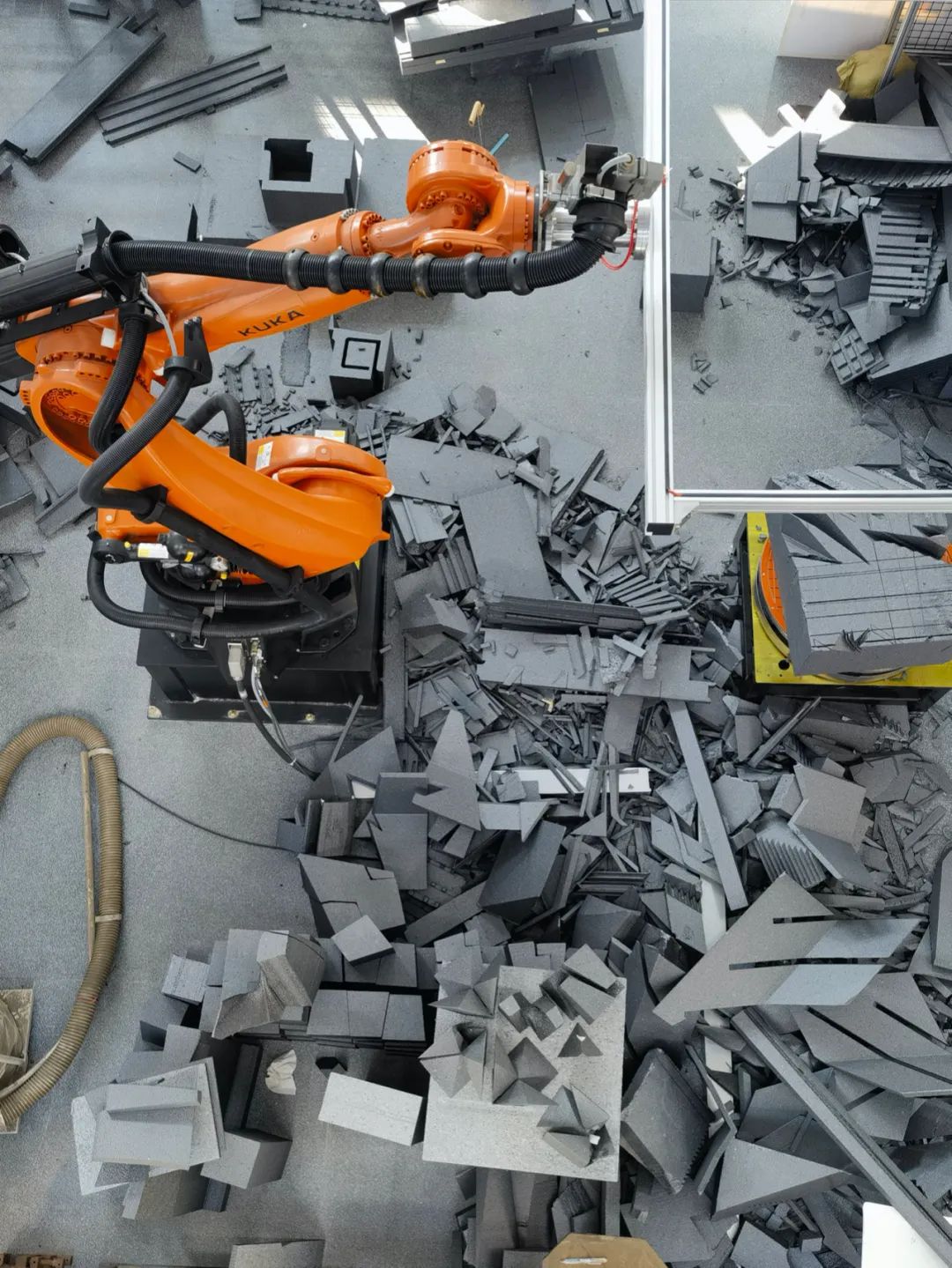 对3类砌块及其子类型(共21种)进行参数化建模,并密排在1.2*1.2*2.4m原材料方块中,以便于批量化线切割并使剩余的边角料最少。使用6轴工业机器人及其变位机实现各种不规则砌块的自动化制造。