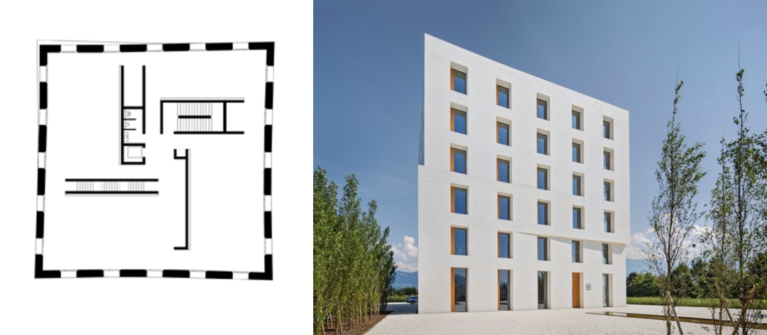 奥地利2226办公楼诠释了Baumschlager Eberle Architekten事务所的极简主义生态理念,充分利用阳光、风等自然条件以及室内的人与设备产生的“废热”来调控室内热环境,在不使用空调暖气的情况下使室温保持在22-26度范围内。结构由风车状核心筒与外墙共同承重,提供了灵活的室内空间布局。外围护结构为双层砌筑结构,具有优秀的保温与承重性能。