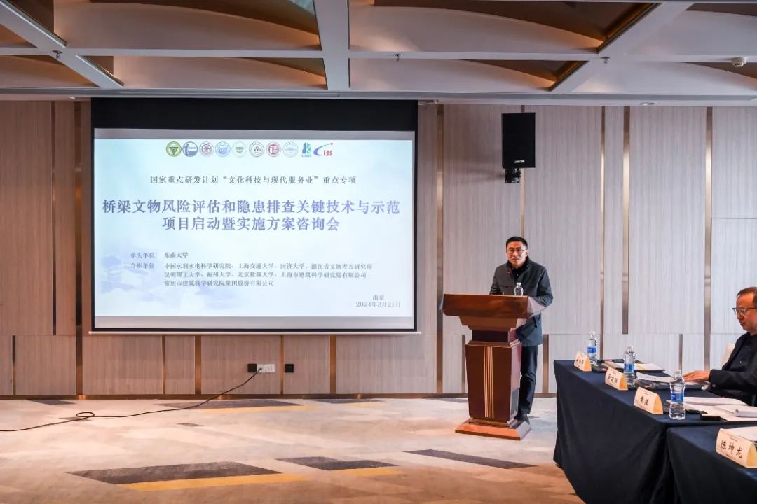 2024年3月21日,由东南大学牵头、万博manbetx官网 淳庆教授主持的“十四五”国家重点研发计划“文化科技与现代服务业”重点专项“桥梁文物风险评估和隐患排查关键技术与示范” (2023YFF0906100)项目启动暨实施方案咨询会在南京举行,会议采用线下方式进行。“桥梁文物风险评估和隐患排查关键技术与示范”项目于2023年11月立项,下设5个课题。项目由东南大学牵头,协同中国水利水电科学研究院、上海交通大学、同济大学、浙江省文物考古研究所、昆明理工大学、福州大学、上海市建筑科学研究院有限公司、常州市建筑科学研究院集团股份有限公司、北京建筑大学共同开展研究工作。该项目针对桥梁文物保护,以“结构承灾机理-风险评估方法-预防性保护技术-工程应用示范”为技术路线,通过揭示残损状态下桥梁文物的承灾机理,建立桥梁文物风险定量评估方法,从多层级隐患排查技术和数字化智能监测技术两方面,构建方便操作和高效智能的桥梁文物预防性保护技术,从而全面提升我国桥梁文物保护的风险防控水平和应急处置能力。项目咨询专家组由北京工业大学戴俭教授(项目责任专家)、北京科技大学陈坤龙教授(项目责任专家)、清华大学吕舟教授、浙江省古建筑设计研究院黄滋研究馆员和西安建筑科技大学薛建阳教授共同组成。国家自然科学基金委员会高技术研究发展中心副主任卞曙光、现代服务业处处长张金国、项目主管刘佐珠;国家文物局科技教育司司长罗静、干部郭宇与王彦人;江苏省文化和旅游厅二级巡视员姚文中、文物管理处处长周强;东南大学副校长孙立涛、科研院高新办主任刘威、万博manbetx官网 院长张彤与副院长李向锋;项目总负责及课题一负责人东南大学淳庆教授、课题二负责人中国水利水电科学研究院刘有志正高级工程师、课题三负责人上海交通大学曹永康教授、课题四负责人同济大学戴仕炳教授、课题五负责人浙江省文物考古研究所邵浦建研究馆员以及各课题任务负责人、课题骨干等50余人参加了本次会议。项目启动会和实施方案咨询会分别由万博manbetx官网 副院长李向锋和北京工业大学戴俭教授主持。