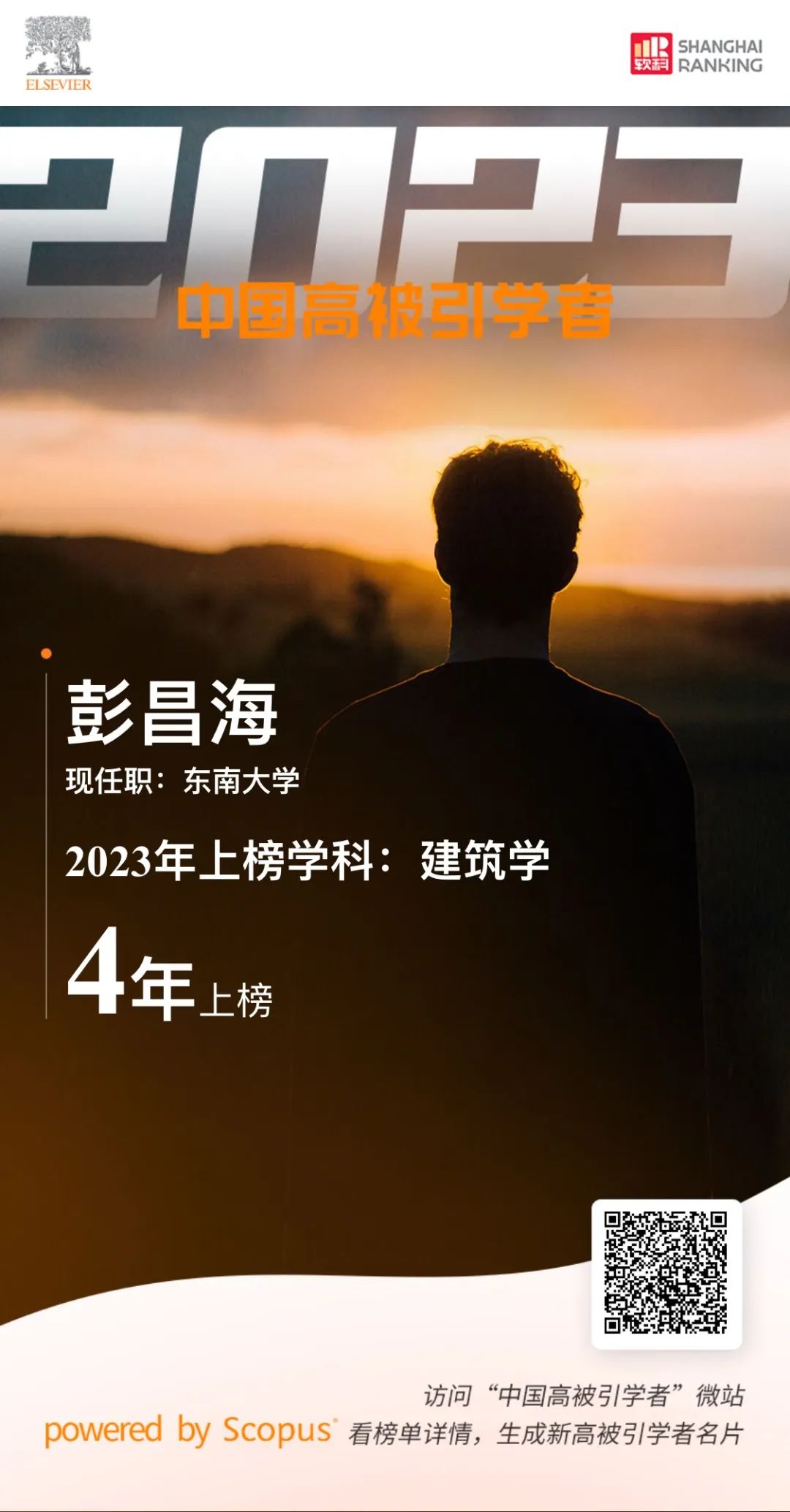2024年3月27日,爱思唯尔(Elsevier)正式发布了2023“中国高被引学者”(Highly Cited Chinese Researchers)榜单,最终评选出5801名“中国高被引学者”。榜单显示,东南大学共有72位学者入选2023年“中国高被引学者”榜单,万博manbetx官网 建筑技术与科学研究所彭昌海教授入围本榜单(全国建筑学科仅11人)。继2020年以来,彭昌海教授已连续四年入选爱思唯尔高被引学者榜单!