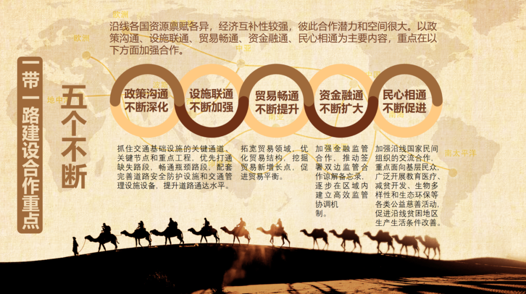 接着,党课详细描述了一带一路的战略内容,包括政策沟通、设施联通、贸易畅通、资金融通以及民心相通五个方面。这些方面构成了一带一路倡议的核心内容,旨在促进沿线国家之间的合作与交流,实现共同发展。课程进一步阐述了通过这些合作建设实现“不断深化”的目标,这一目标的实现将有助于打造开放、包容、均衡、普惠的区域经济合作架构,为参与国家带来更多机遇和发展空间。