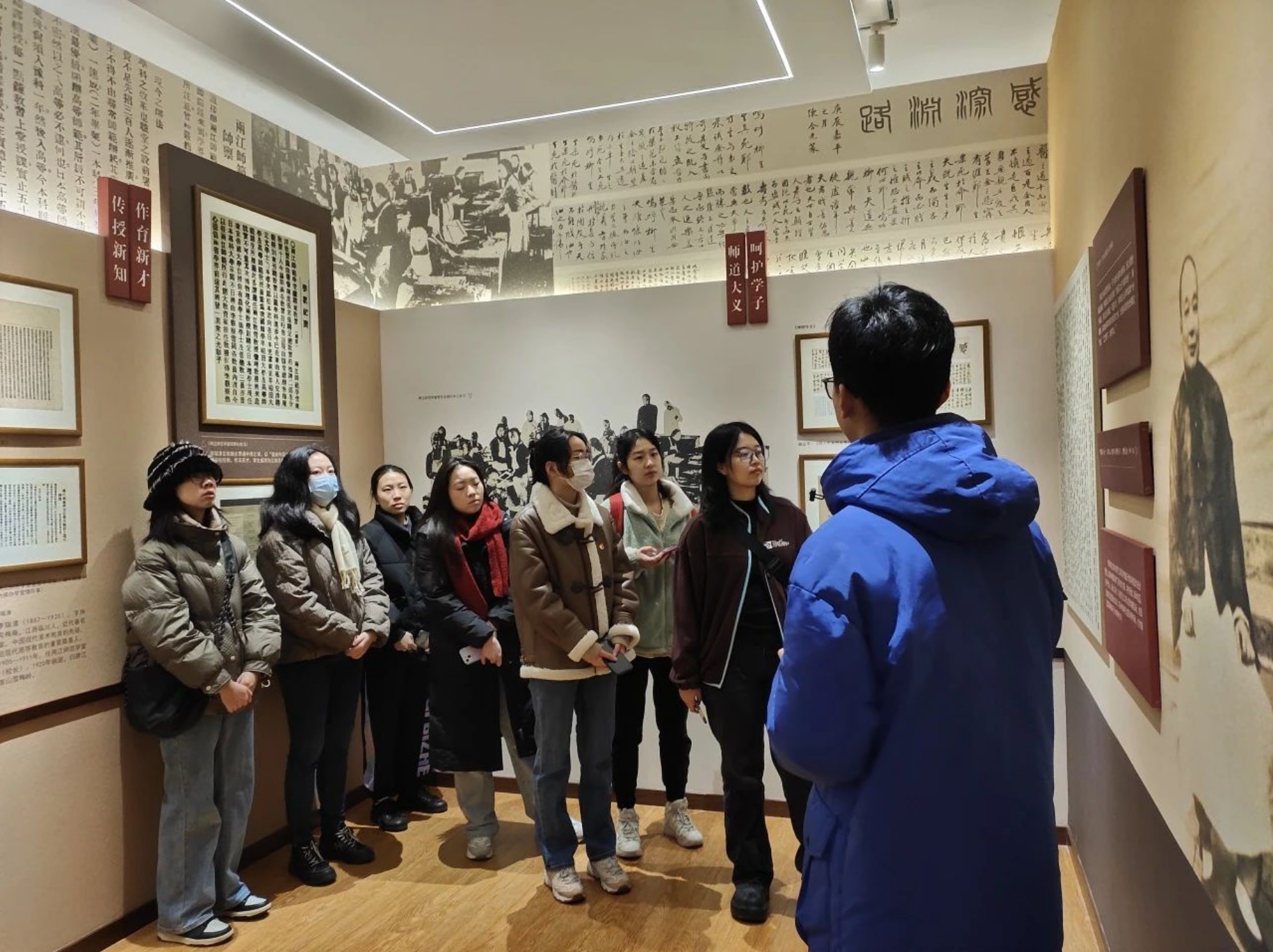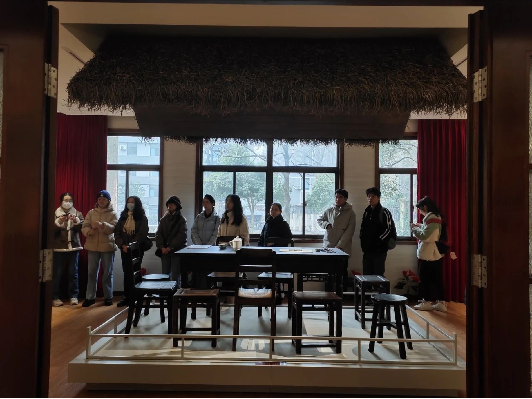 一进入梅庵,厚重的历史气息迎面而来。循着历史的足迹,同学们首先参观了“梅庵”展厅。梅庵曾是会议、讲习场所,同时还是红色革命基地,初为茅屋,1933年中央大学将之改建为砖混结构平房,作为音乐教室使用。其平面布局采用内廊式,既有西式风格,又具中式风采。在梅庵正面,有著名历史学家柳诒徵于1947年6月9日题写的“梅庵”二字匾额。