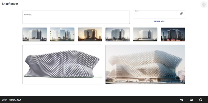 (5)批量生成建筑表现图。截取计算机程序中生成的最终细化模型,在SnapRender中选择渲染风格,通过不同的风格选择和提示词调节,学生可以批量生成各种效果的表现图。
