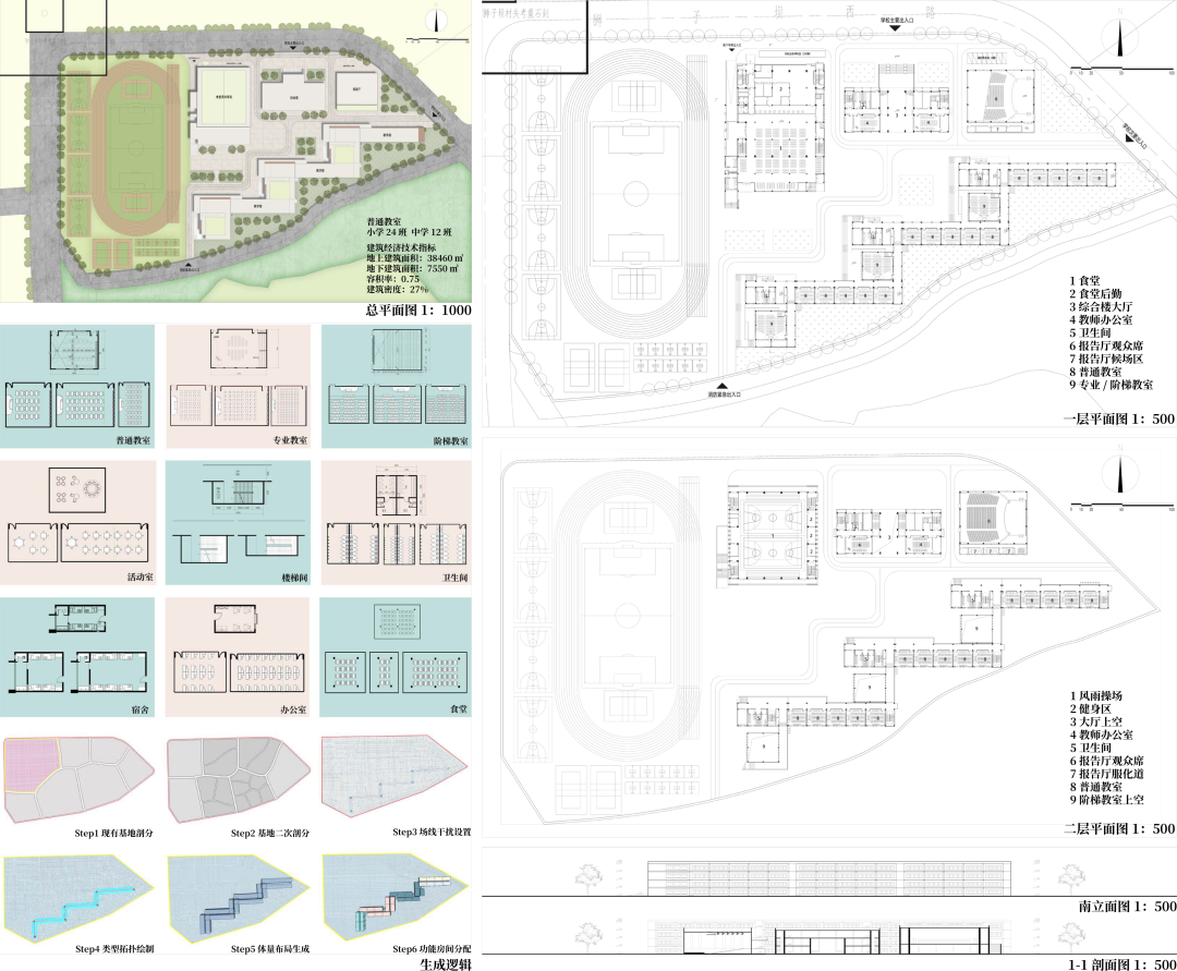 (2)类型分析与方案试做。学生应充分了解中小学的设计要点,根据场地条件和设计目标定义类型原型;进而结合建筑规模和相关规范,整理各栋建筑房间分配的任务计划表;