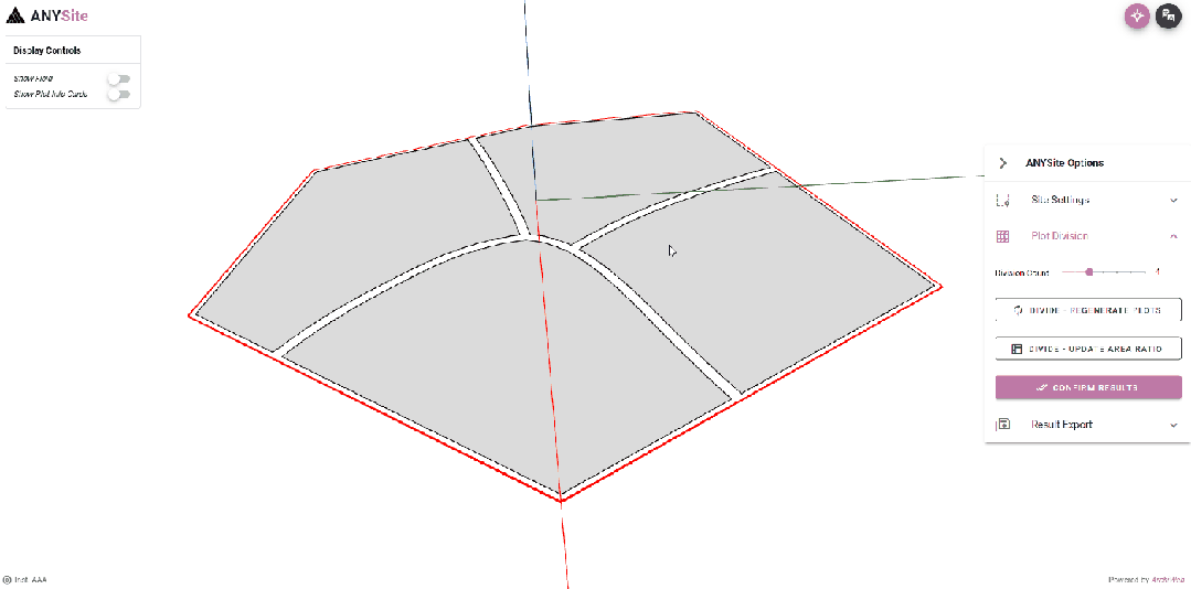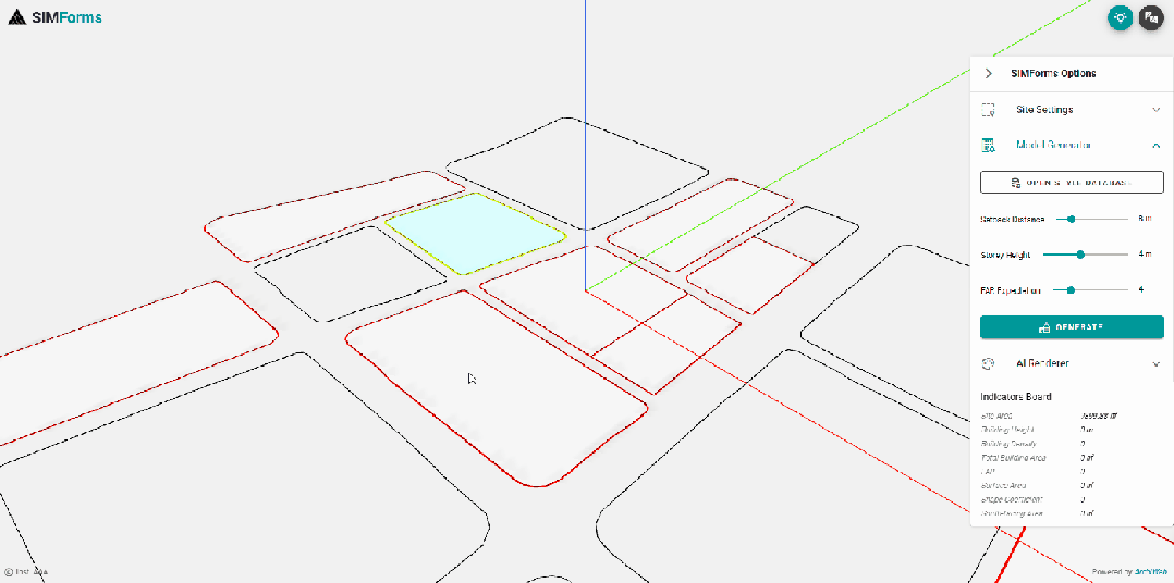 (1)场地划分。学生需要根据实际的场地环境,决定各个具体功能区的位置、面积和形状,并通过SIMForms和ANYSite进行参数调节,得到地块划分的结果;